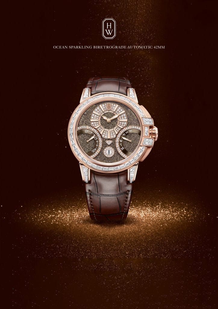 L’Ocean Sparkling Biretrograde Automatic 42mm est présenté sur un élégant bracelet en alligator brun ou bleu et se ferme au poignet par une boucle déployante en or 18 carats sertie de 24 diamants taille baguette. Chaque modèle a été produit en édition limitée à 20 exemplaires.