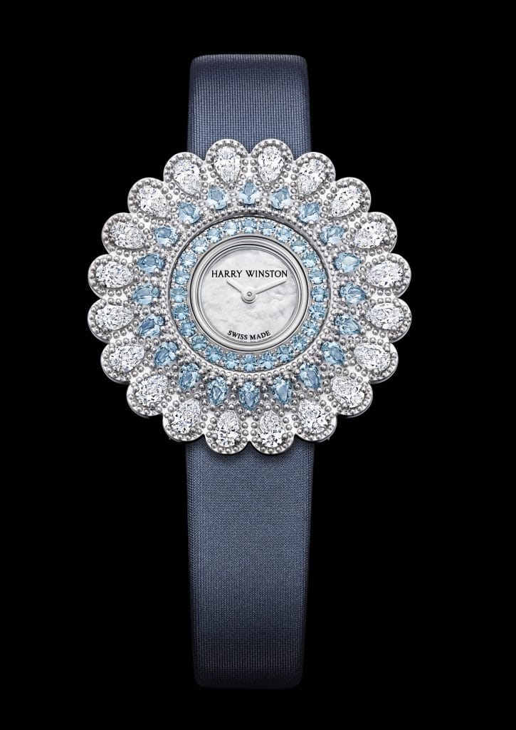 La Maison Harry Winston présente Marquise Time, un garde-temps de Haute Joaillerie aux multiples facettes, qui vous éblouira tout autant en montre-bracelet qu’en pendentif. Inspirée de la fraise, ce large col à volants typique de la Renaissance, la montre Marquise Time séduit par ses volutes serties d’aigues-marines et de diamants.