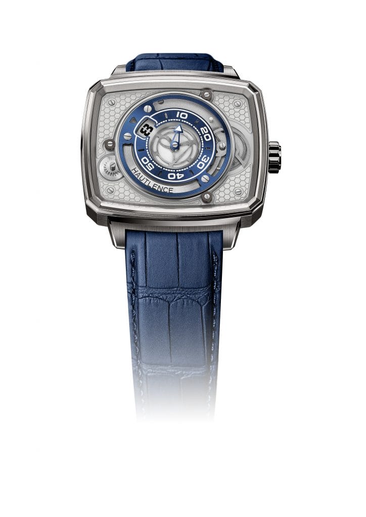 Le modèle HL Newton arbore le boîtier de forme TV screen cher à HAUTLENCE. La boîte, en titane, a été retravaillée pour l’occasion afin de réinterpréter les codes d’origine de la marque. Agrandie et munie d’une plus large ouverture sur le cadran, elle met la complication à l’honneur tout en conservant des proportions harmonieuses. La couronne crantée est en titane et porte le logo HAUTLENCE gravé. Le cadran opalin de base est muni d’inserts argentés gravés du motif HONEYCOMB caractéristique de la marque, qui ajoutent un second niveau au cadran. Un bracelet en cuir d’alligator à grandes écailles carrées bleu, rappelant la nuance du guichet mobile, vient parachever l’ensemble.