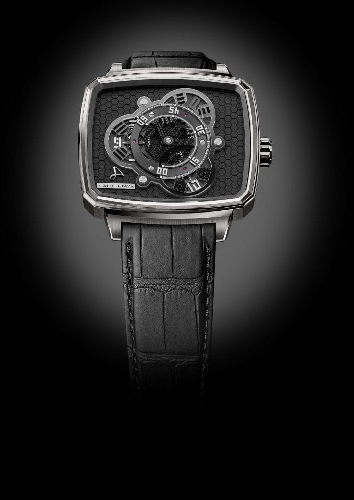 Évoluant sur différents niveaux, 4 disques apportent du volume au cadran de base d’un noir intense. Le plus grand, en saphir orné du motif signature de HAUTLENCE, le décor HONEYCOMB, affiche les minutes sur un secteur de 240°. Gravitant autour de ce point central et répartis de manière équilibrée sur le cadran, 3 plus petits disques squelettés laissent apparaître, lorsqu’ils sont placés selon le bon alignement, les chiffres des heures. La typographie choisie pour les heures évoque les chiffres digitaux, réinterprétés mécaniquement. Un clin d’oeil dont s’amuse HAUTLENCE, qui aime brouiller les pistes.