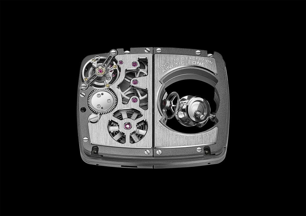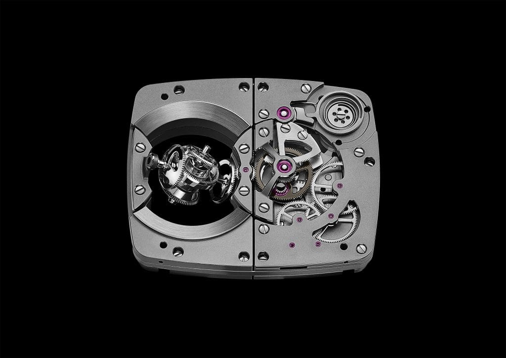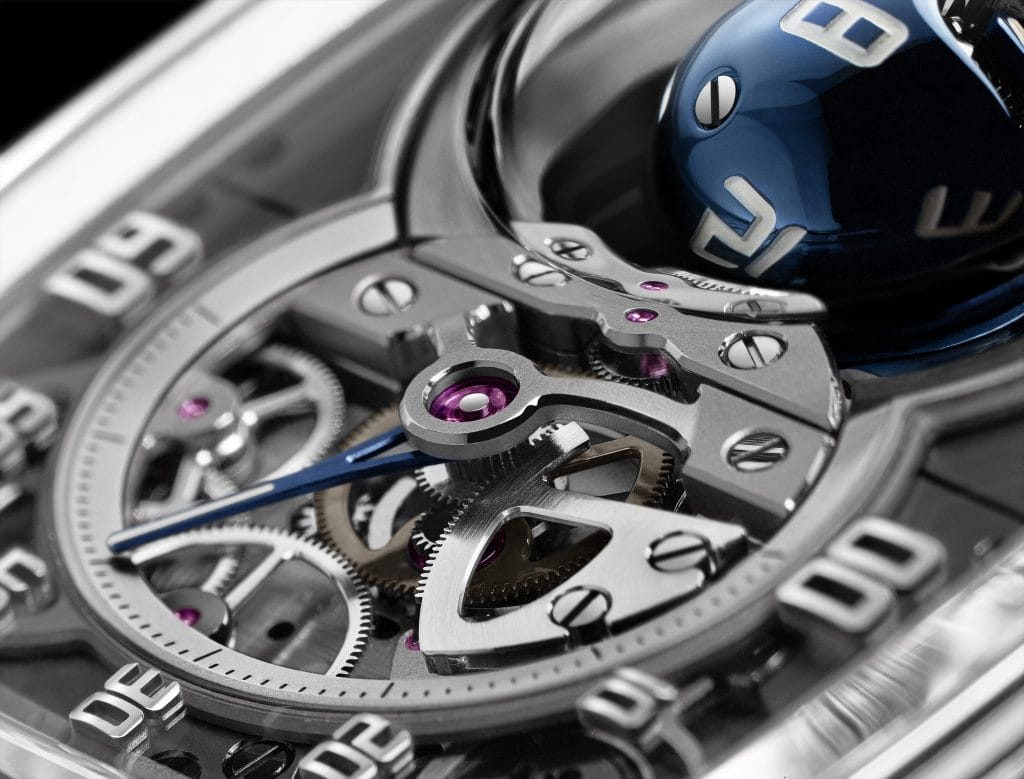 Occupant la partie gauche du boîtier, magnifiquement mise en scène par un verre saphir muni d’un petit dôme, une sphère bleue attire tous les regards. Elle comporte douze chiffres gravés et tourne sur elle-même sur trois axes de rotation pour révéler l’heure qu’il est. Ce ballet hypnotique, qui semble de prime abord totalement aléatoire, répond au contraire à une chorégraphie bien précise, orchestrée par quatre engrenages coniques qui évoluent autour de deux axes croisés inclinés de 21 degrés. Habillant ce différentiel conique, deux coques en titane poli, avec un traitement PVD bleu, viennent se compléter dans un ying et yang horloger, de manière à composer une sphère.