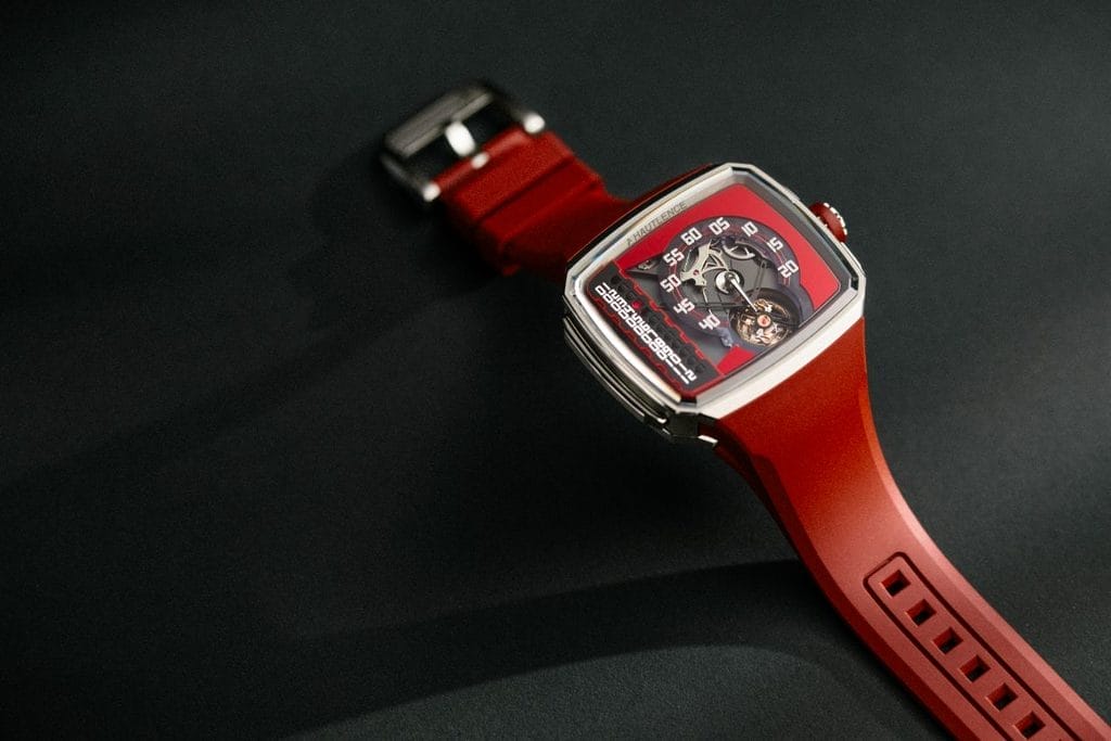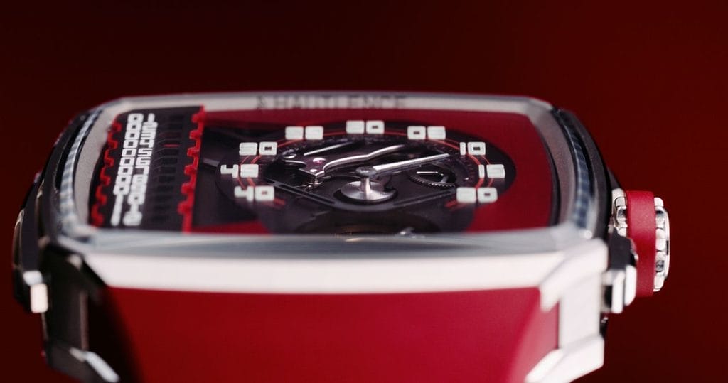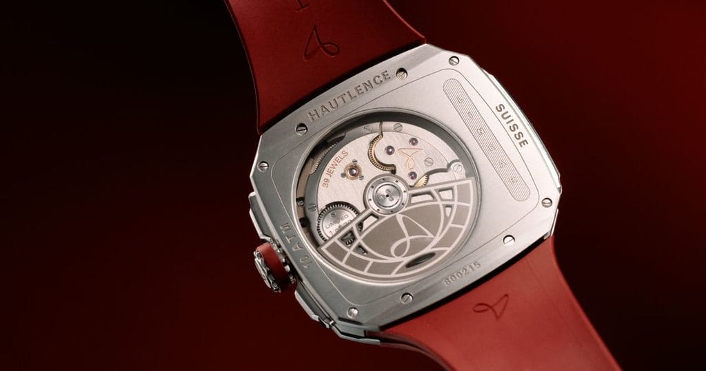 Le boîtier, en acier, garantit robustesse et étanchéité jusqu’à 10 ATM. Ses flancs texturés lui confèrent du relief et une dynamique visuelle forte. Sa forme, immédiatement reconnaissable, fait partie intégrante de l’identité Hautlence. La couronne crantée est surmontée d’un anneau en caoutchouc rouge, en écho au bracelet assorti.