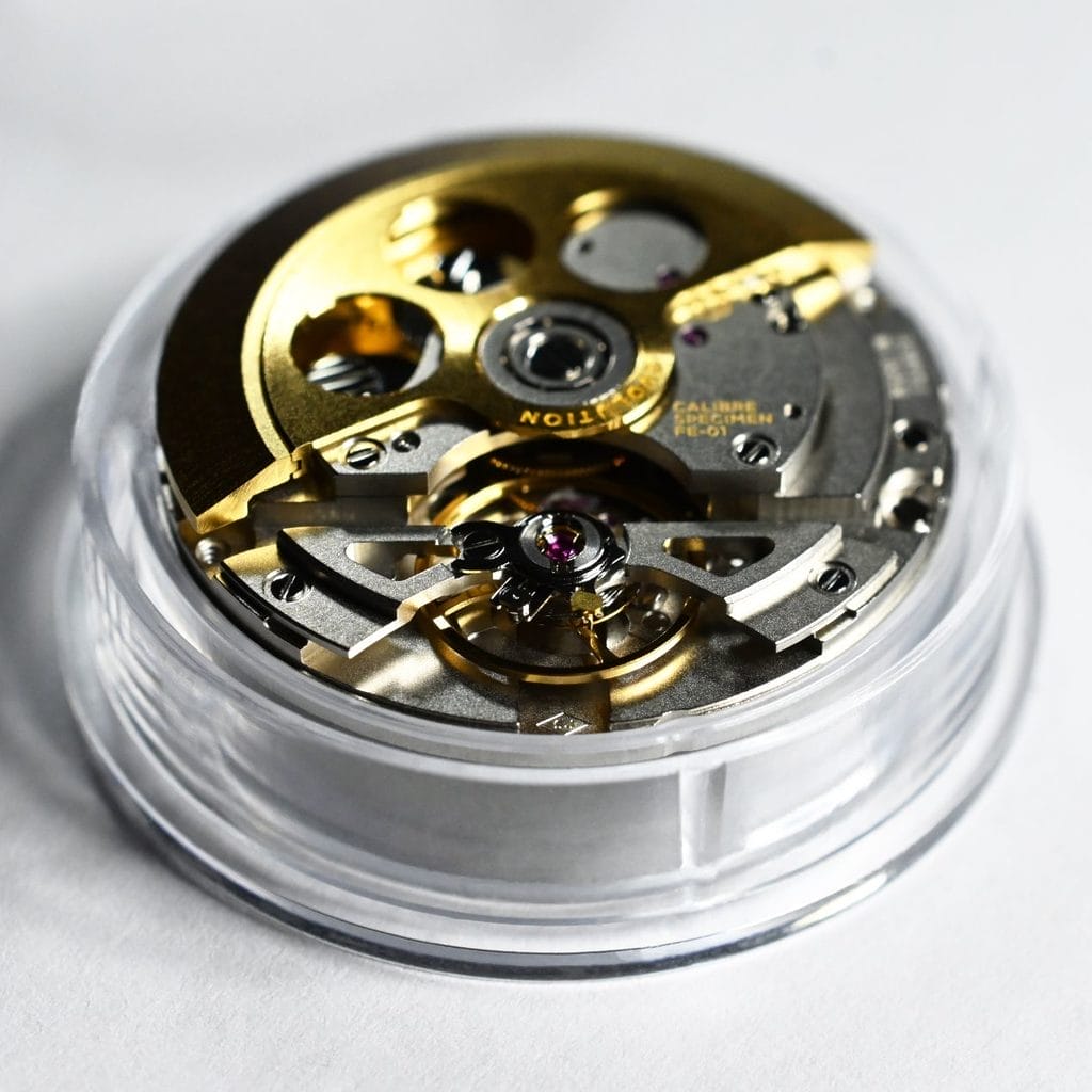 Le Calibre Specimen FE-01 est un mouvement mécanique à remontage automatique. Il affiche les heures, minutes, secondes au centre et la date à 3 heures, avec correction rapide. Animé à 4 Hz (28 800 alternances par heure), il garantit une réserve de marche de 44 heures et une précision de -4/+6 secondes par jour, en ligne avec les standards des grandes manufactures suisses.