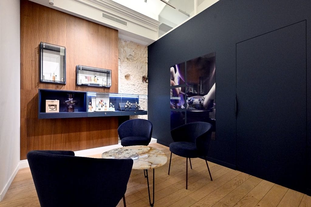 Pensée comme un lieu intime et chaleureux, la boutique s’articule autour d’un aménagement jouant sur la profondeur et la découverte, dans un espace de 80 m². Les murs dévoilent les traces du passé, subtilement révélées pour s’accorder avec des lignes contemporaines et une mise en lumière élégante des collections.