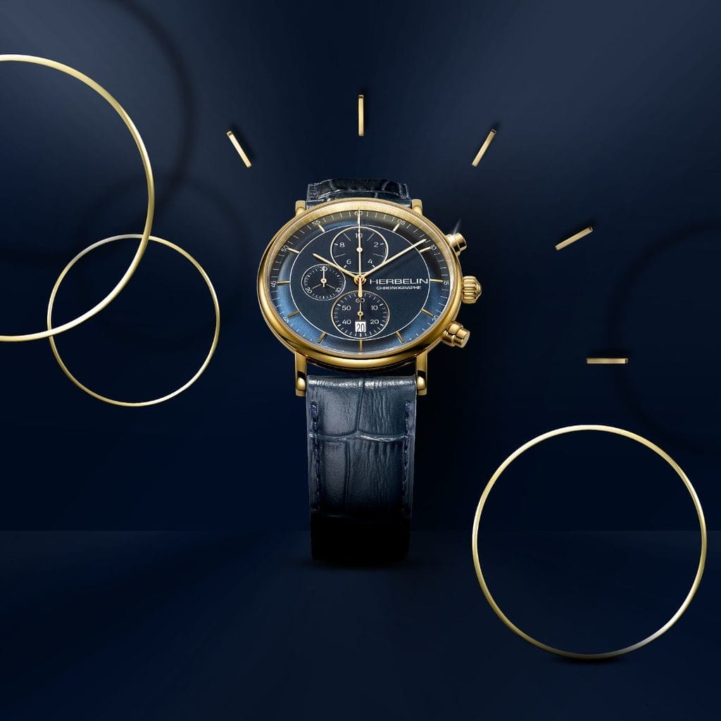 Inspirée des premiers modèles des années 50 du patrimoine horloger de la maison HERBELIN, la collection Inspiration, lancée en 2017, réinterprète les codes horlogers de l’époque. Ce chronographe ne déroge pas à la règle : carrure toute en rondeur, couronne boule cannelée, cornes discrètes effilées, fine lunette et verre saphir bombé. Mis en scène dans un écrin de 40 mm en acier PVD or jaune poli, ils contrebalancent l’esthétique contemporaine du cadran. Bleu nuit, celui-ci offre une lisibilité optimale, orchestrant les informations tout en sobriété.