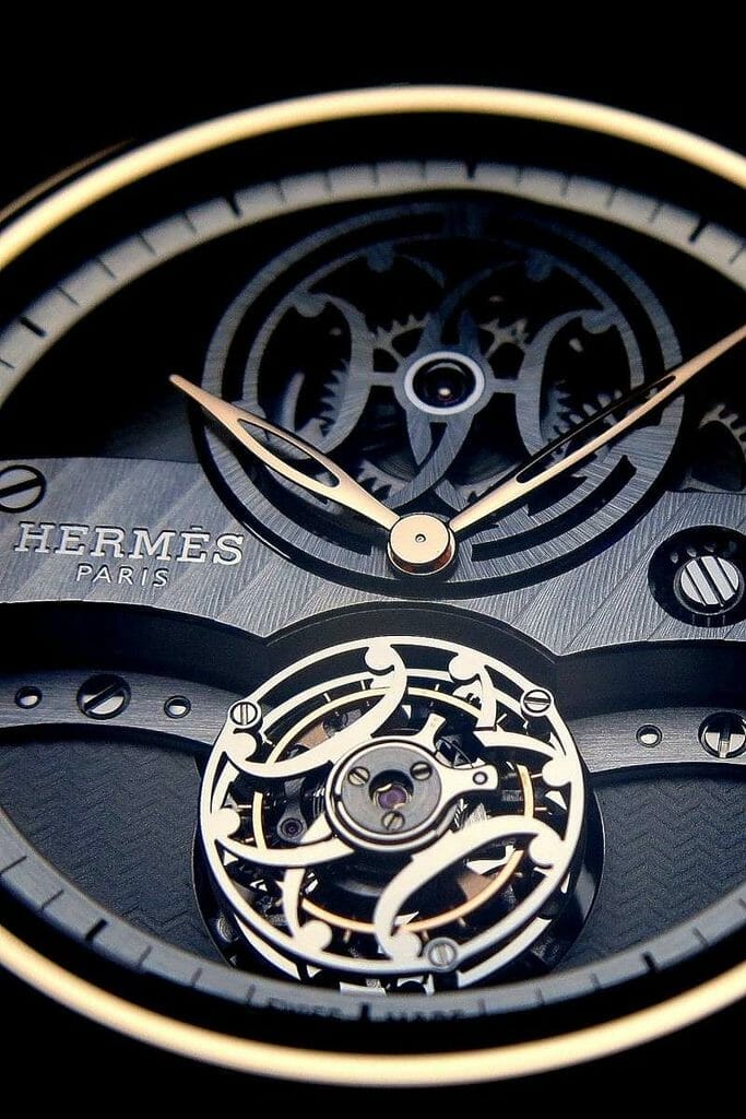 Ce garde-temps est animé par le calibre H1923 développé par la Manufacture Vaucher dont le Tourbillon est celui créé par La Joux-Perret. « H » pour Hermès, et 1923 pour l’année de construction de l’ascenseur du magasin. Ce fut un défi technique pour l’élaborer. La seule décoration du mouvement nécessite quarante heures de travail. Et il faut le même temps pour assembler ce mouvement, véritable oeuvre de haute-horlogerie.