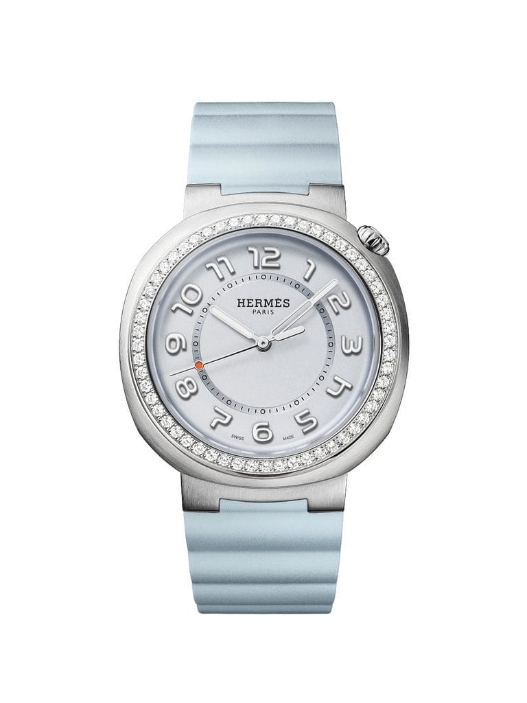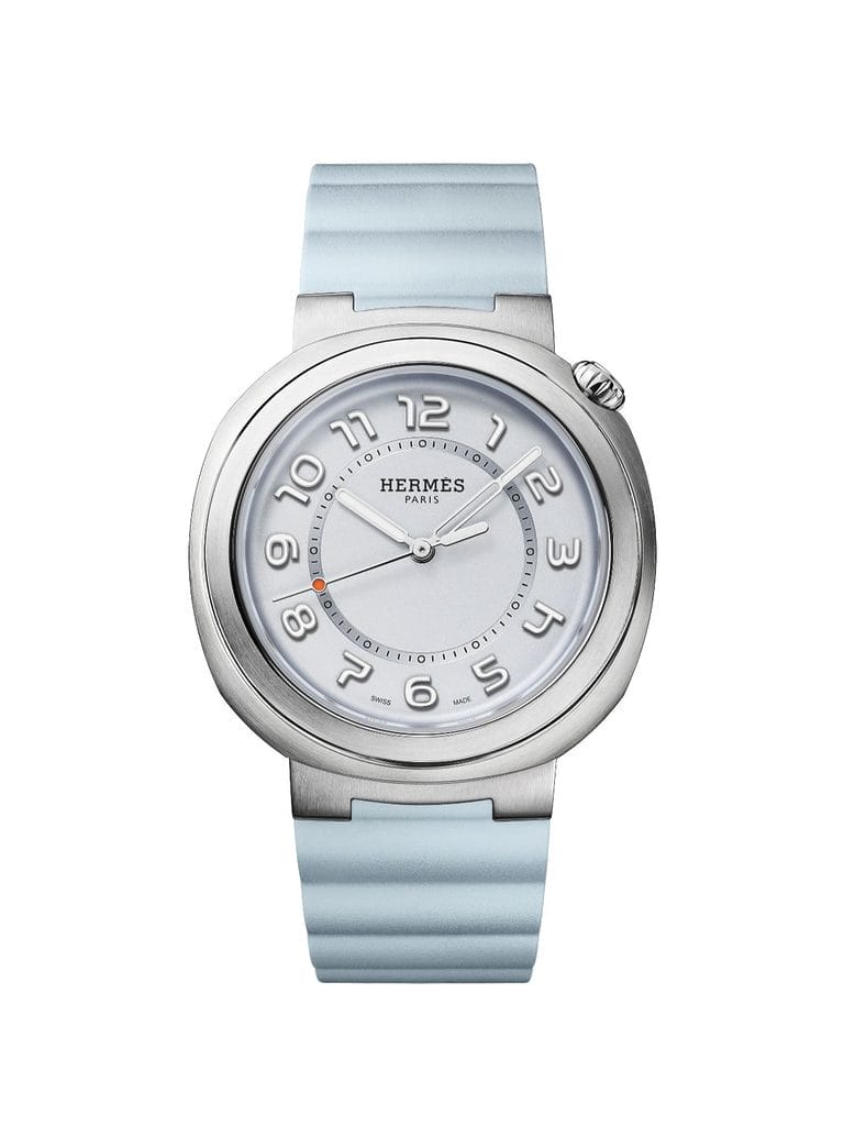 Le boîtier de 36 mm, en acier, présente un galbe généreux souligné par l’alternance de surfaces polies et satinées. Il renferme le mouvement de manufacture Hermès H1912, mécanique à remontage automatique.