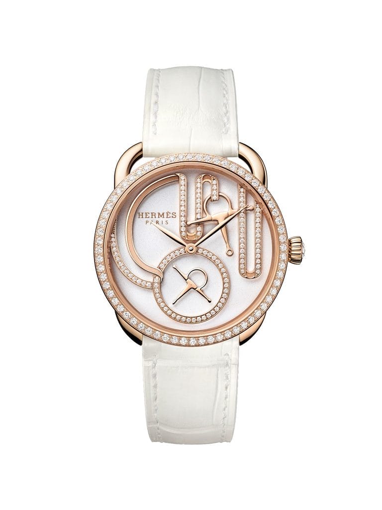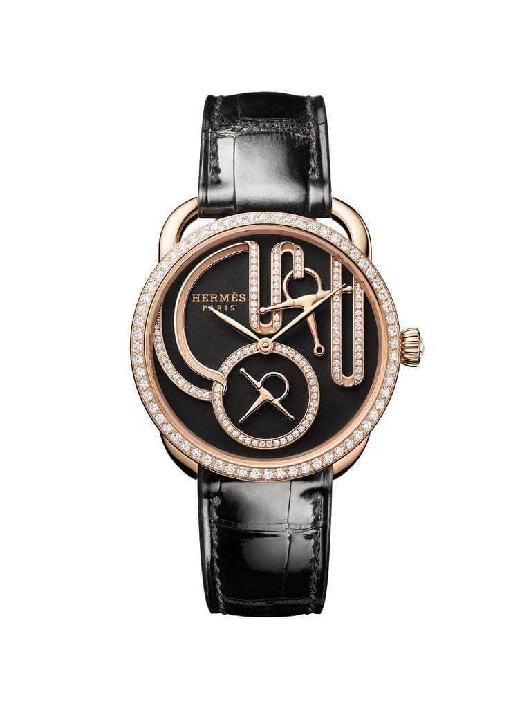 de 110 diamants, formant un décor graphique et délié à la fois. Animé par une petite seconde en forme de mors, l’ensemble prend vie au rythme du mouvement de manufacture Hermès H1912, dévoilé par le fond en saphir du boîtier. Réalisé au sein des ateliers Hermès Horloger, un bracelet en alligator lisse chantilly ou noir s’accorde à la couleur du cadran.