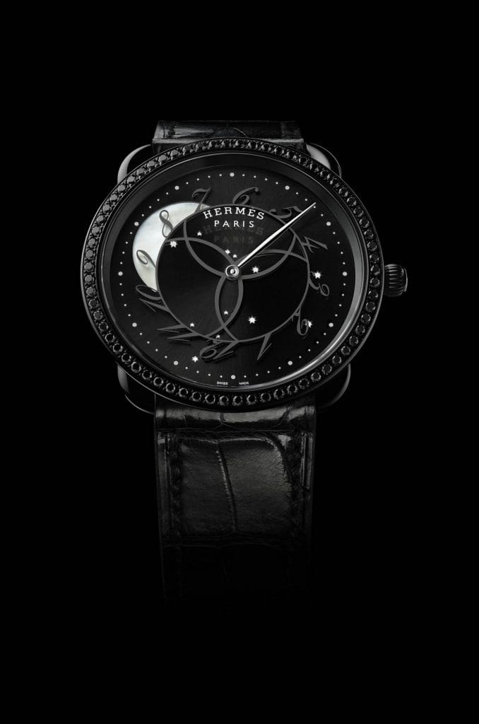 La montre Arceau, imaginée par Henri d’Origny en 1978, prête son allure, à la fois sobre et singulière, à une nouvelle expression du temps selon Hermès. Une création ludique, paradoxale, qui soustrait la lune à sa fonction attendue. Ici, le satellite de la Terre donne l’heure : les chiffres tournoient au clair de lune, tandis que l’aiguille des minutes pointe les astres lointains d’une constellation. Depuis son origine, le boîtier rond de l’Arceau repose sur un étrier rectangulaire, dessinant une silhouette aux lignes intemporelles. Sa lunette noire parée de spinelles noirs brille d’une lumière nocturne et intense. Son cadran noir brillant soleillé s’anime d’un carrousel de chiffres inclinés survolant une lune irisée. De cette obscurité radieuse se détachent lune et étoiles façonnées en nacre et révélées par une laque luminescente. Limitée à 300 exemplaires, la montre Arceau Ronde des heures se noue au poignet par un bracelet en alligator noir, réalisé par les artisans d’Hermès.