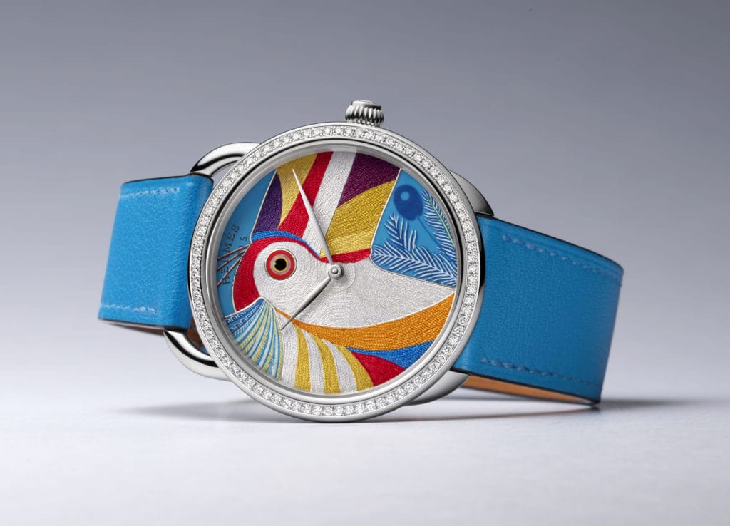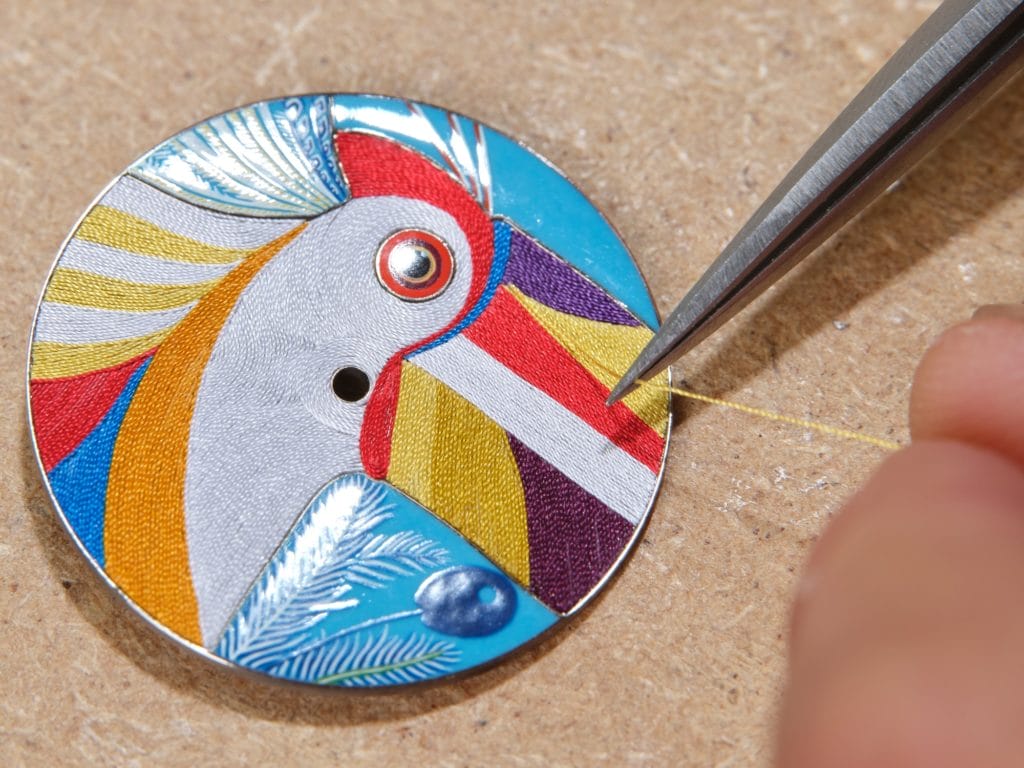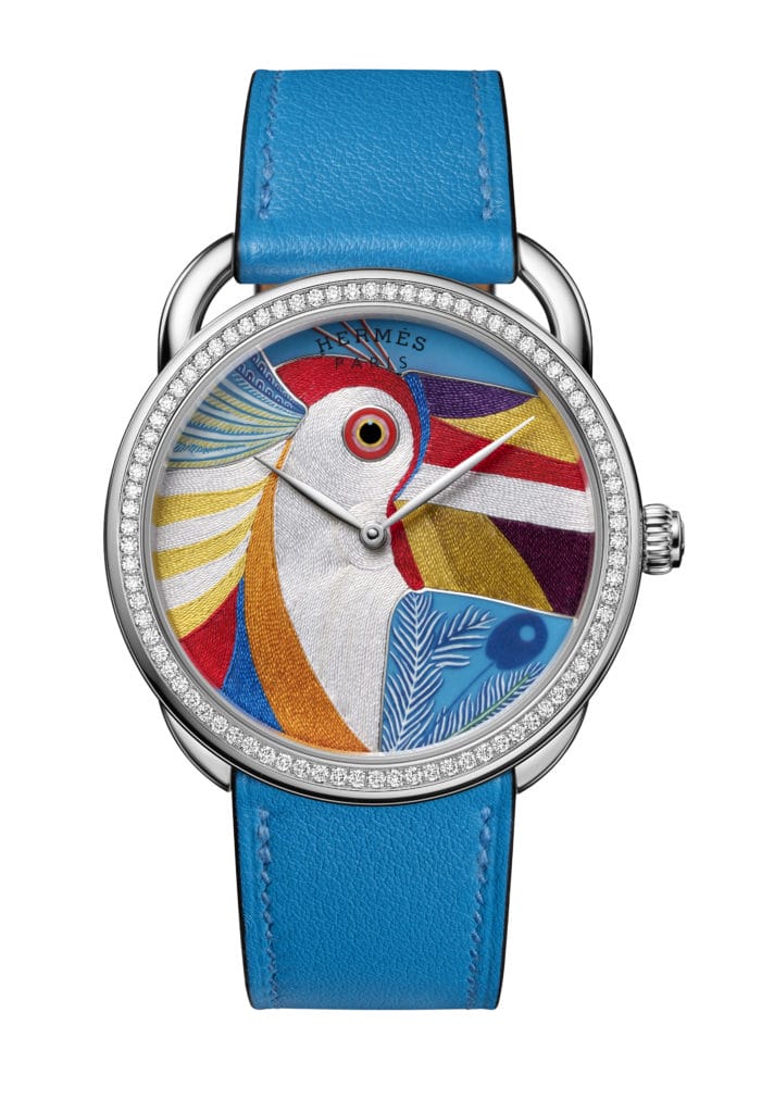 Son cadran conjugue deux métiers d’art aussi exigeants que remarquables, qui ont requis cinq ans de mise au point : des fils de soie multicolores, mis en lumière par l’intensité de l’émail miniature. D’une extrême minutie, la technique unique et exclusive à Hermès des fils de soie trouve son inspiration d’un atelier de tissage de kimono au Japon. Choisi pour son dessin vibrant, l’oiseau amazonien se compose de 500 fils assemblés un à un, et prend vie au terme d’une semaine d’ouvrage.
