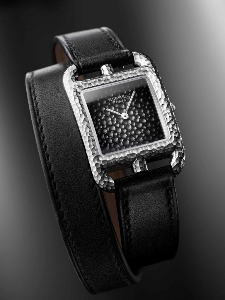 Aujourd’hui, ce classique en mouvement prête ses formes équilibrées à la technique du martelage un savoir-faire bijoutier d’excellence. Ce procédé complexe et sophistiqué confère au boîtier en acier un effet de matière à l’aspect patiné. Le cadran également martelé est recouvert d’une fine couche de laque translucide, dégradée de l’anthracite au noir. Tout en profondeur et aspérité, la matière brute et façonnée dessine un objet à l’allure inattendue. Enfin, la Cape Cod Martelée marie son tempérament décalé à un sobre bracelet en cuir de veau noir, simple ou double tour.