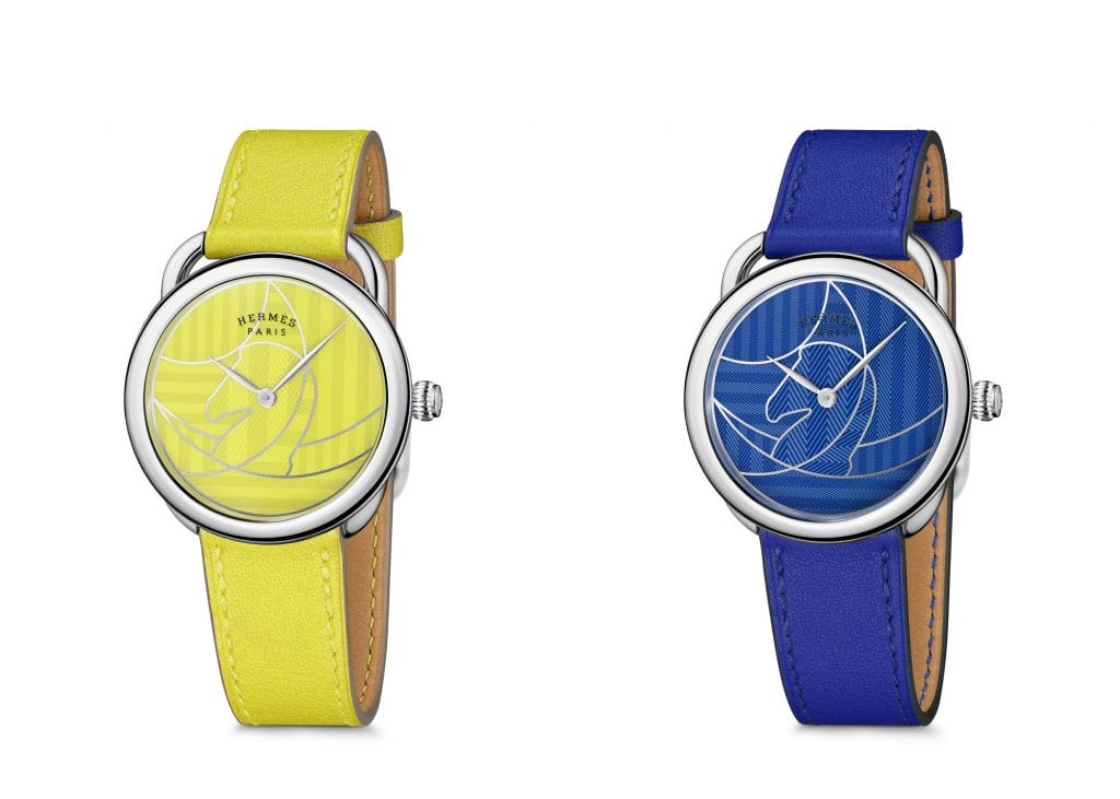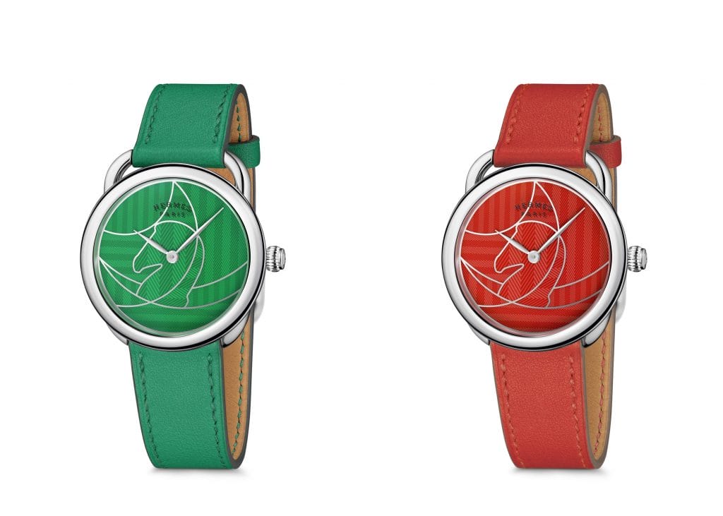 Sur ce fond se profile le motif Cavale. Les techniques d’exécution du cadran associent le champlevé, la laque et la décalque. La base du cadran est d’abord creusée d’alvéoles. Celles-ci sont ensuite remplies de laque. Un motif chevron mat ton sur ton décalqué apporte la touche finale à cette composition qui ne manque pas de couleurs. Vives, elles nous rappellent les pions-chevaux du jeu de notre enfance. Jaune, rouge, vert, bleu, lequel sera le plus rapide à se jouer du temps ?