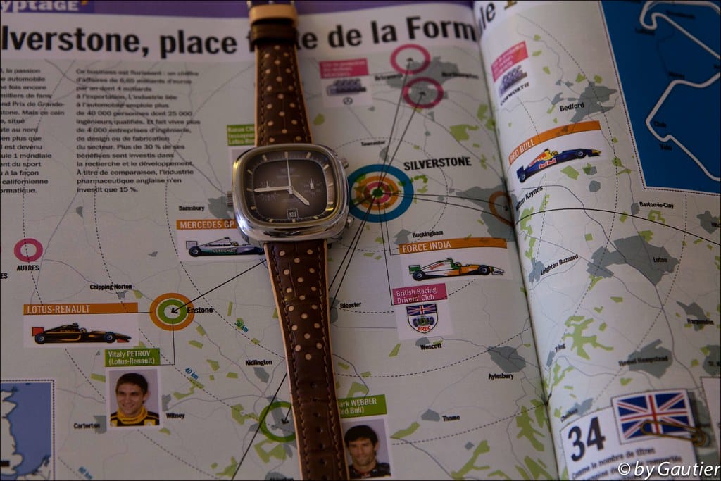 « … pour porter ma dernière acquisition… c’est bien évidemment le week-end du Grand Prix de F1 de Grande Bretagne sur le circuit de Silverstone (ce qui démontre bien le lien entre Heuer et le sport Auto). Même l’Équipe en parle.