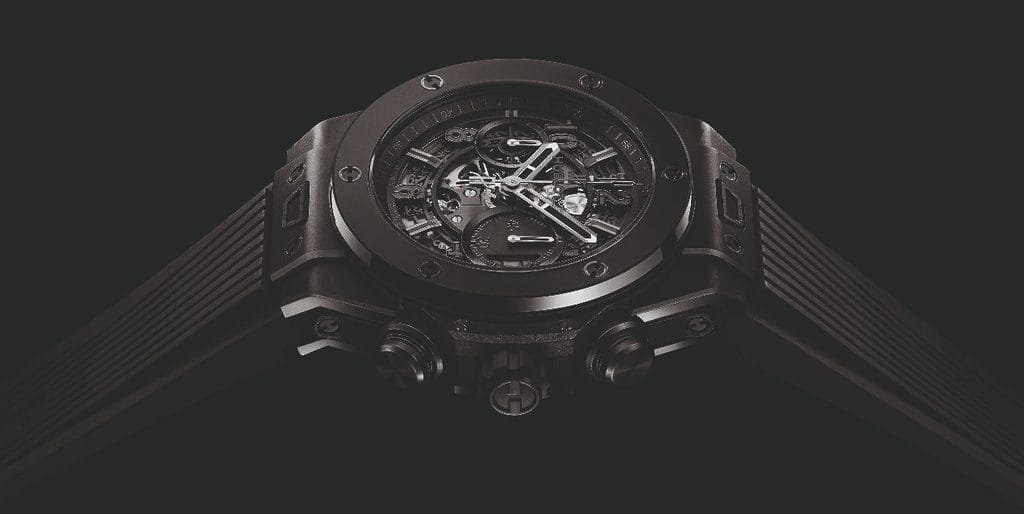 Chez Hublot, le noir n’est pas une simple couleur, c’est un langage. Un langage qui s’exprime à travers des matières d’exception : la céramique mate, le saphir fumé, et des surfaces texturées qui jouent avec la lumière pour créer des reflets subtils et profonds. Ce n’est pas seulement le boîtier qui est noir, mais chaque élément de la montre, des aiguilles aux index, en passant par la boucle et les poussoirs, jusqu’à la masse oscillante.