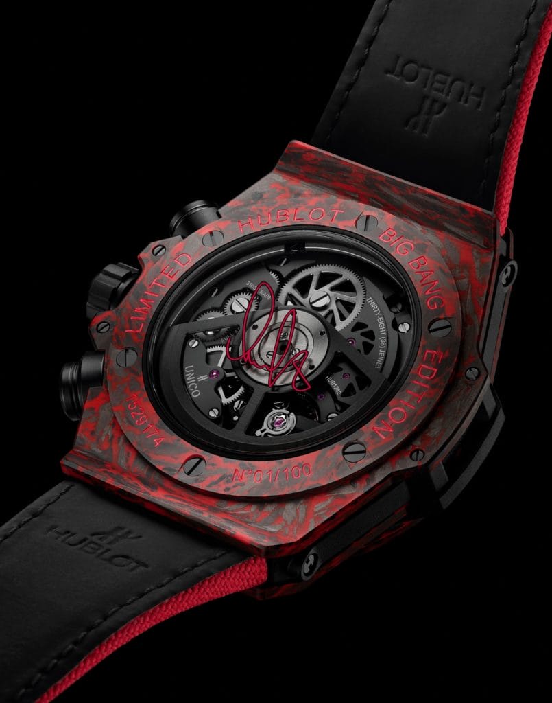 La Hublot Big Bang Unico Red Carbon Alex Ovechkin présente encore d’autres détails personnalisés. Clin d’œil au numéro du maillot d’Alexander Ovechkin, le logo du « Grand Huit » est placé à 8 heures sur le cadran. La signature d’Ovi apparaît en outre sur le fond du boîtier muni d’une glace saphir. Un ultime détail est apporté à l’extrémité de l’aiguille de chronographe : un clin d’œil au drapeau russe et aux couleurs des Washington Capitals.