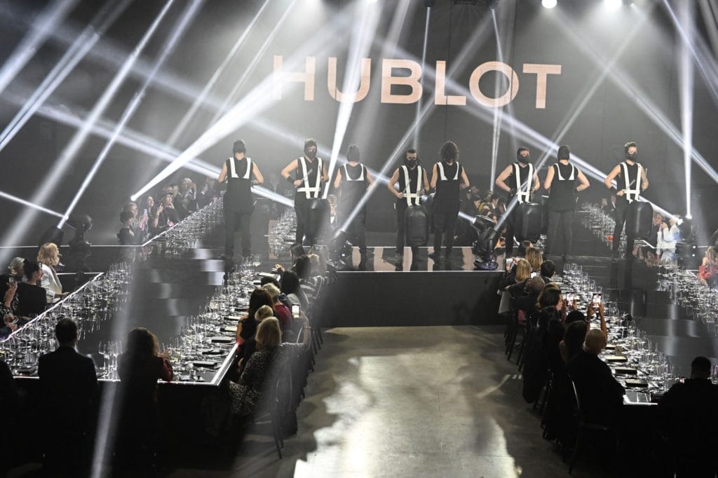 En parallèle de la semaine de la mode milanaise, l’inauguration de cette nouvelle boutique a donné lieu à une soirée dont seul Hublot a le secret. Hôtes de la soirée, Ricardo Guadalupe, CEO de Hublot, et Chiara Ferragni, ambassadrice globale de la Maison, femme d’affaires, entrepreneuse et influenceuse, ont accueilli la centaine d’invités triés sur le volet et les médias, dans les impressionnantes halles East End Studios, une ancienne fabrique d’avions datant du début du vingtième siècle. Là, une gigantesque table de 21 mètres de long et 16 mètres de large reprenant la forme du logo Hublot a accommodé les invités pour un repas de gala concocté par Da Vittorio, fameux restaurant italien noté 3 étoiles au Guide Michelin. Au centre de la table, sur la barre du H, s’est tenu un show incontournable au cours duquel se sont succédé les artistes Mahmood et Blanco en duo. Une performance dont les invités n’ont rien voulu perdre.