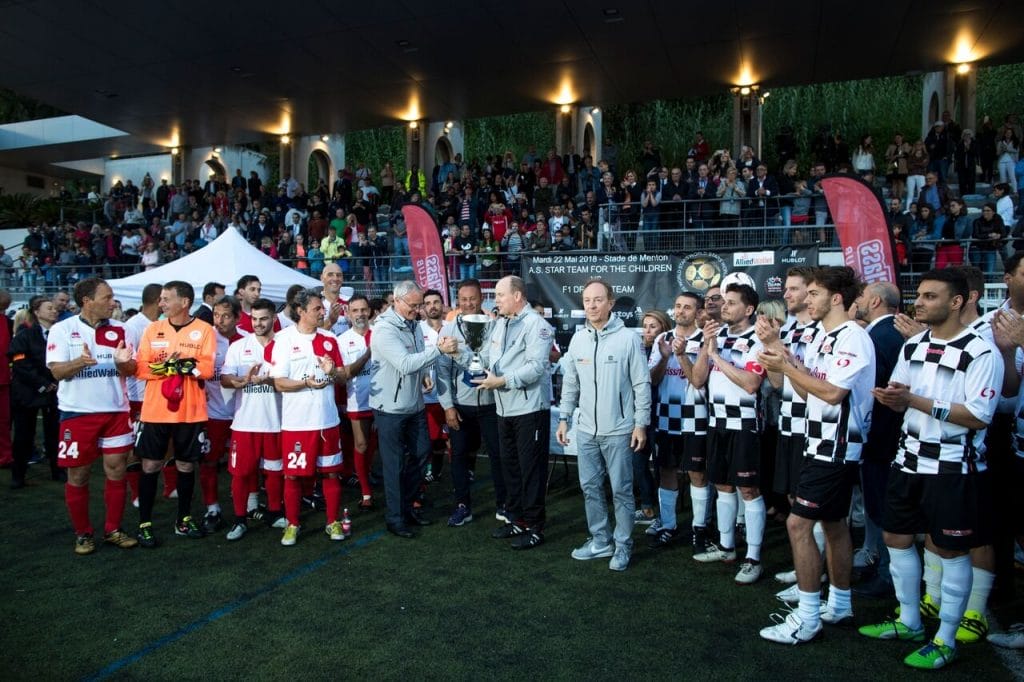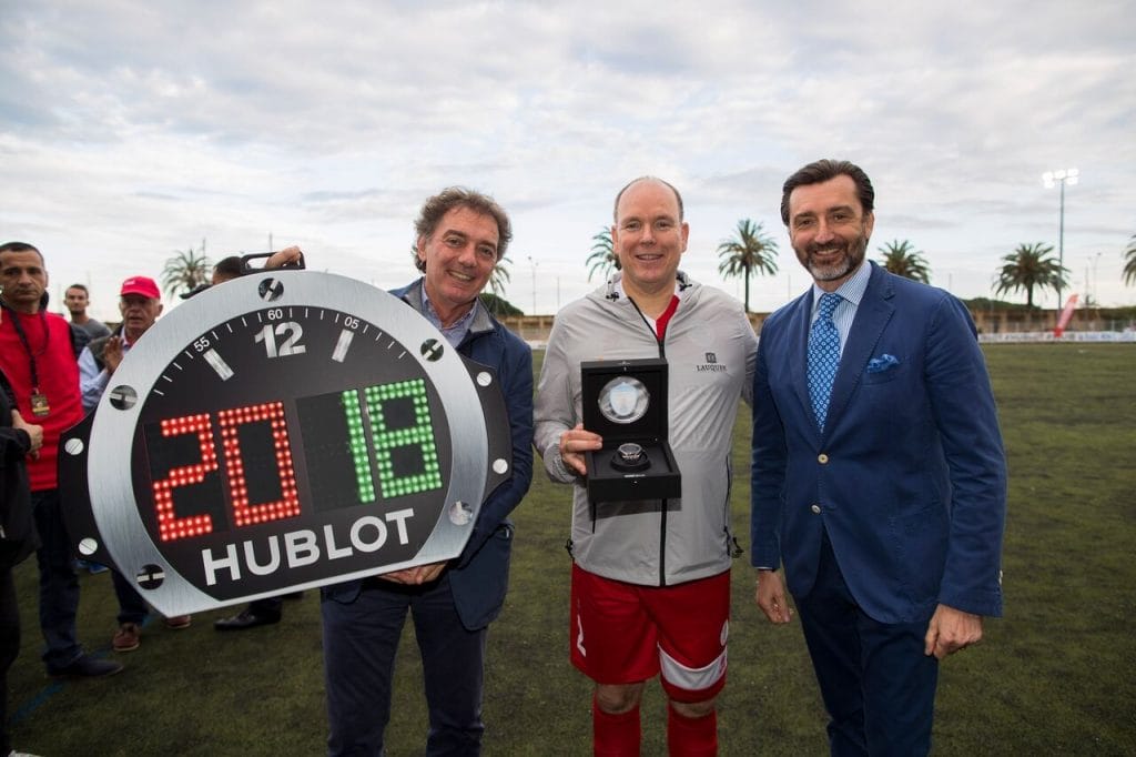 La désormais traditionnelle rencontre de football de la Fondation Star Team MC a vu s’affronter l’équipe de S.A.S le Prince Albert II de Monaco, l’A.S Star Team for the Children, et la Nazionale Piloti, une formation composée de pilotes de Formule 1TM. Les bénéfices de ce match, qui cette année s’est exceptionnellement tenu au stade Garavan à Menton, seront reversés en intégralité à des oeuvres caritatives s’occupant des enfants en difficulté par la Fondation Star Team. Une association qui fêtait lors de cette édition ses 25 ans, une célébration qu’elle a pu partager avec son Président d’Honneur, S.A.S le Prince Albert II de Monaco, qui passait lui-même le cap des 60 ans. C’est ainsi qu’à la mi-temps de la rencontre Benoit Lecigne, General Manager de Hublot France, BeLux, UK, Irlande, Europe de l’Est et Scandinavie, a eu l’honneur de remettre à Son Altesse Sérénissime le Prince Albert II de Monaco une montre Hublot Big Bang Referee 2018, première montre connectée conçue par la manufacture de Nyon et qui sera portée par les arbitres de la Coupe du Monde FIFA 2018 en Russie. Cette smartwatch permettra à son porteur de suivre à chaque seconde tous les détails des rencontres en cours.