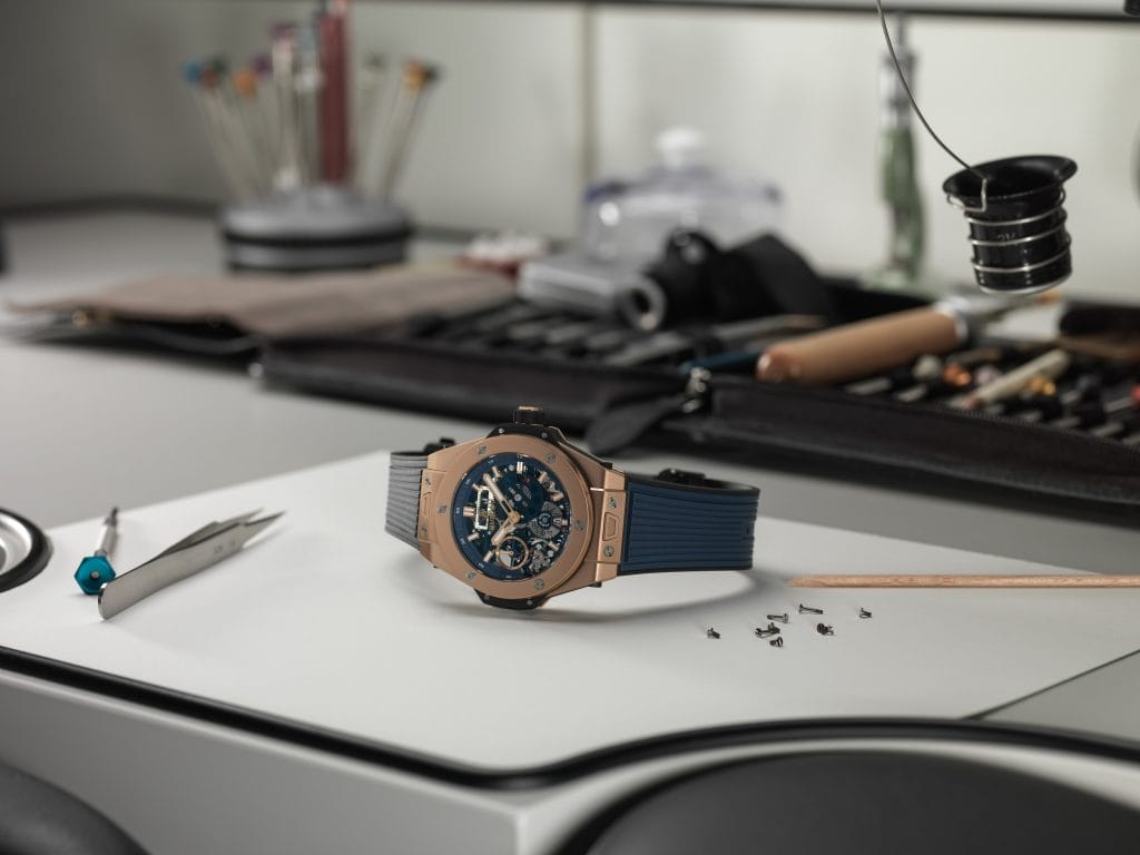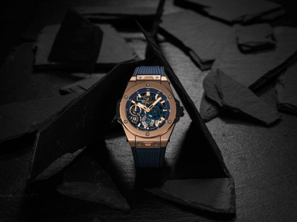 Un second modèle en King Gold – alliage Hublot exclusif – marie l’éclat de l’or rouge à la profondeur du cadran squelette bleu mat. Pourvu d’un fond saphir, ce duo se noue au poing par un bracelet en caoutchouc structuré et ligné avec système d’attache « One Click », pour un changement rapide et aisé, en toute sécurité.