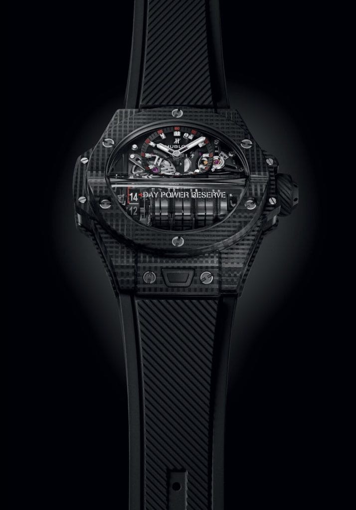 Alchimiste des matières high tech, Hublot compose sa nouvelle Big Bang MP-11 en carbone 3D. Ce matériau ultraléger, renforcé par un tissage en trois dimensions, façonne la carrosserie d’un nouveau moteur de compétition. Equipée de 7 barillets en série, pour une autonomie de 14 jours, cette mécanique architecturale dévoile ses cylindres en ligne dans un boîtier aux facettes tridimensionnelles et flancs fumés noirs.