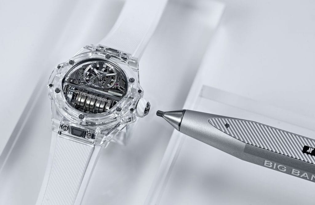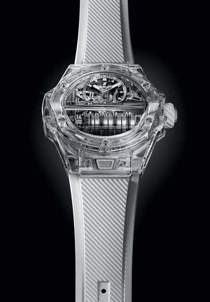 Limitée à 200 exemplaires, la nouvelle Big-Bang MP-11 se présente aux côtés de son antithèse chromatique, sculptée, elle, dans la transparence du saphir. Passé maître dans la production à grande échelle de ce matériau le plus dur et le plus résistant après le diamant, Hublot franchit un nouveau cap avec ce boîtier cristallin dont le renflement suit la courbe des barillets cylindriques. Aussi remarquables que le moteur qu’elles abritent, carrure, glace et lunette en saphir bombent au niveau des cylindres, créant un effet loupe sur l’indicateur de réserve de marche. Une prouesse d’ingénierie, tant cette matière extrêmement dure est complexe à usiner.