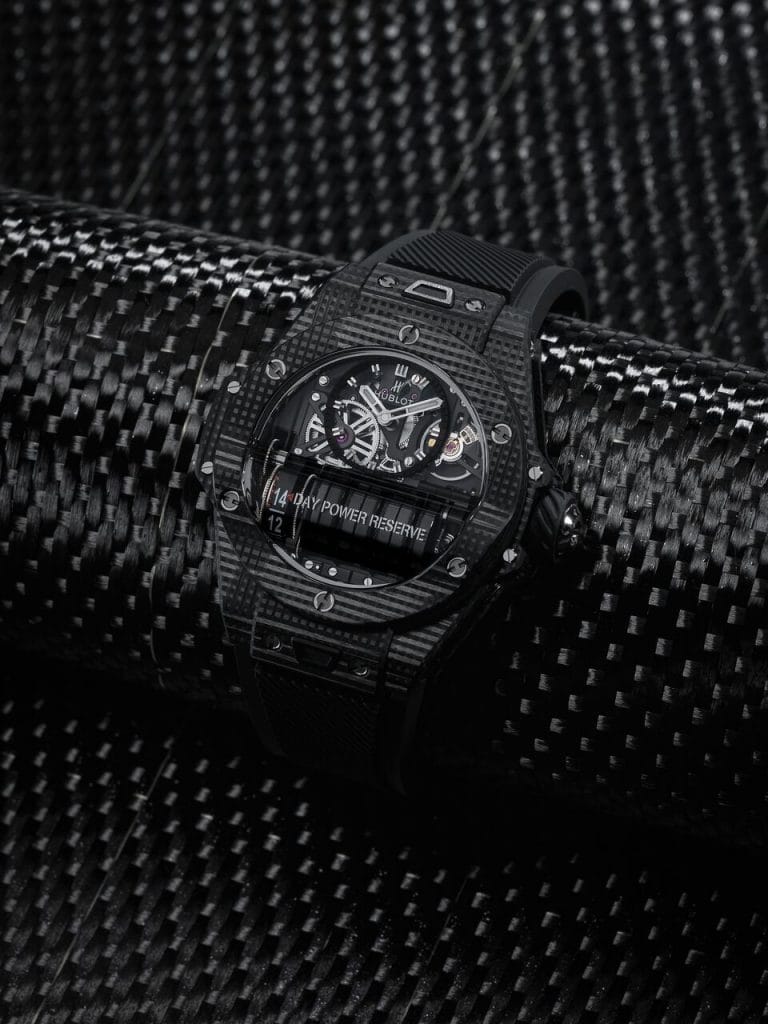 D’inspiration « All Black », cette Big-Blang est forgée de composite à matrice polymère (PMC), renforcé par des fibres et tissés en trois dimensions. Outre une légèreté et une résistance sans pareil – bracelet compris, la montre ne pèse que 90 grammes ! – la structure tridimensionnelle du carbone dessine des facettes et des reflets uniques. Transparents, le cadran et les flancs en verre fumé du boîtier de 45 mm révèlent une architecture d’inspiration moteur, ajourée et traitée PVD noir. En écho au design mécanique, la couronne et le bracelet de caoutchouc ligné reprennent la structure hélicoïdale d’une vis sans fin. Enfin, ce nouveau mouvement de manufacture à l’autonomie exceptionnelle se remonte manuellement via la grande couronne cannelée ou à l’aide d’un stylet électrique à empreinte Torx inspiré de la course automobile.