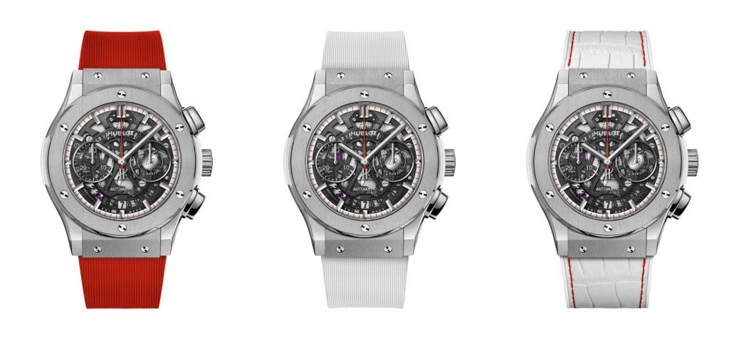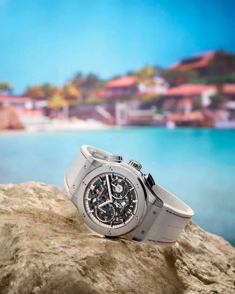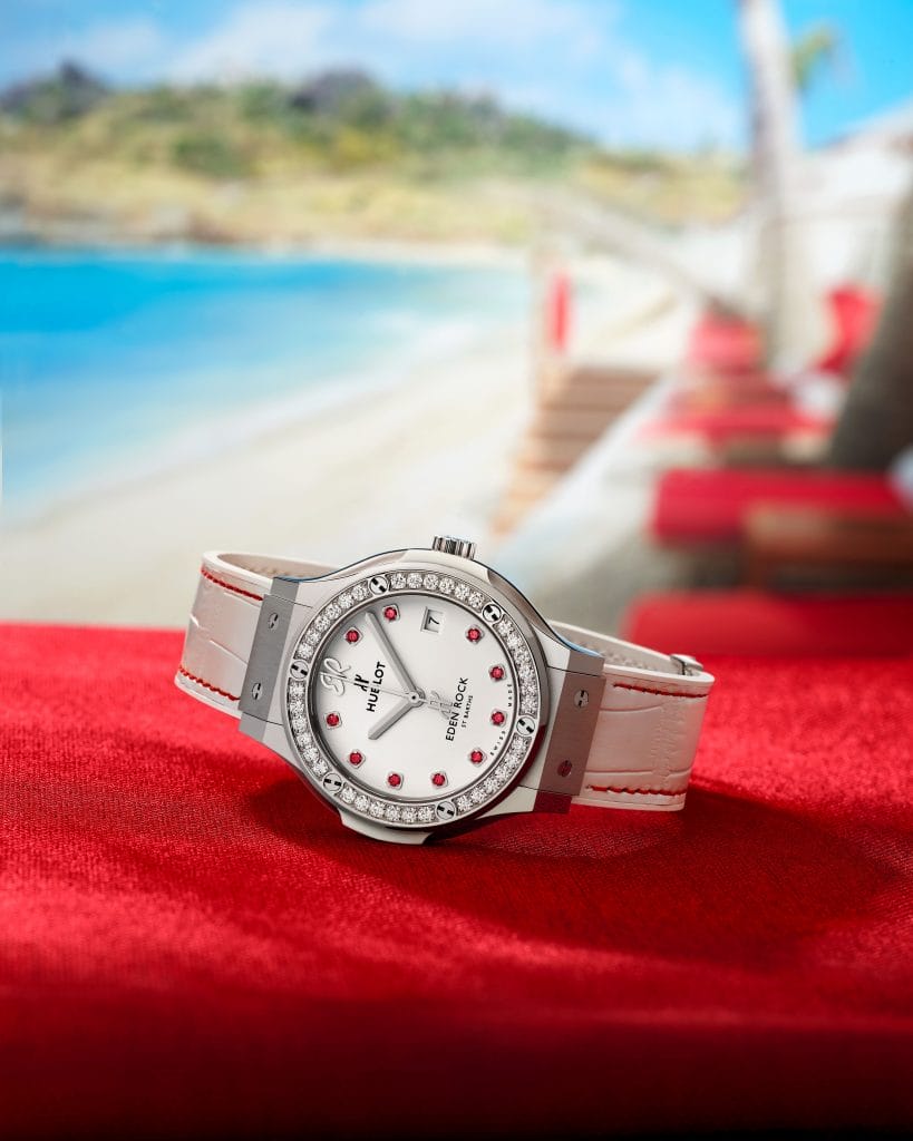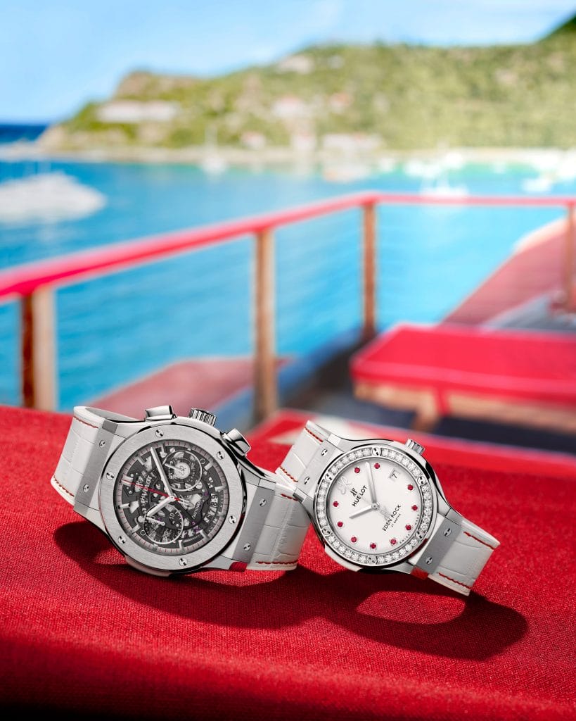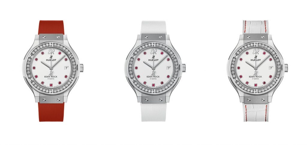 Le mouvement chronographe squelette à remontage automatique HUB1155 signe la collaboration avec Eden Rock St Barths à 3h. La seconde montre, précieuse, resplendit de ses pierres éternelles et de la blancheur laquée du cadran constellé de 10 rubis. Ces deux garde-temps sont livrés avec trois bracelets : le premier en alligator blanc délicatement ourlé de fil rouge et deux full caoutchouc blanc et rouge finement striés.