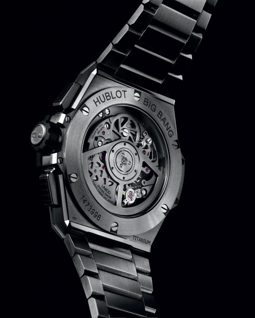 La Big Bang Integral garde son emblématique construction dite « sandwich », sans insert composite cette fois-ci, la montre étant entièrement taillée dans le même matériau – Titane, King Gold, ou Céramique. Seules exceptions, les oreilles de sa lunette en composite noir et la couronne surmoulée de caoutchouc.