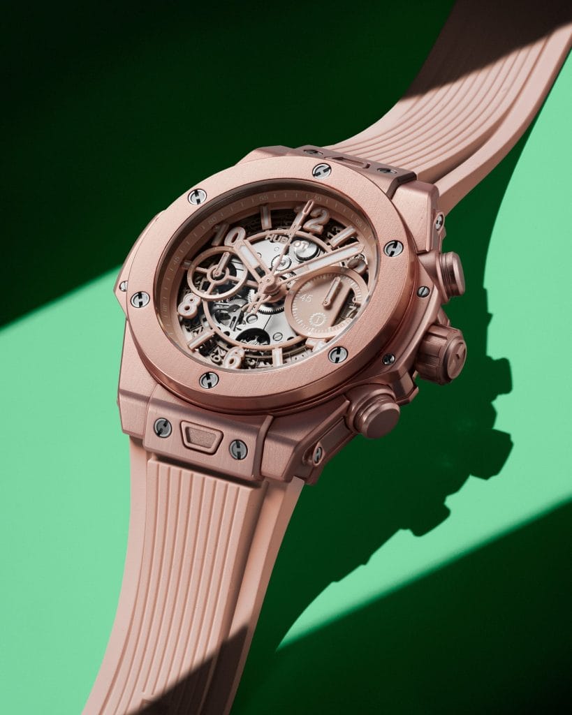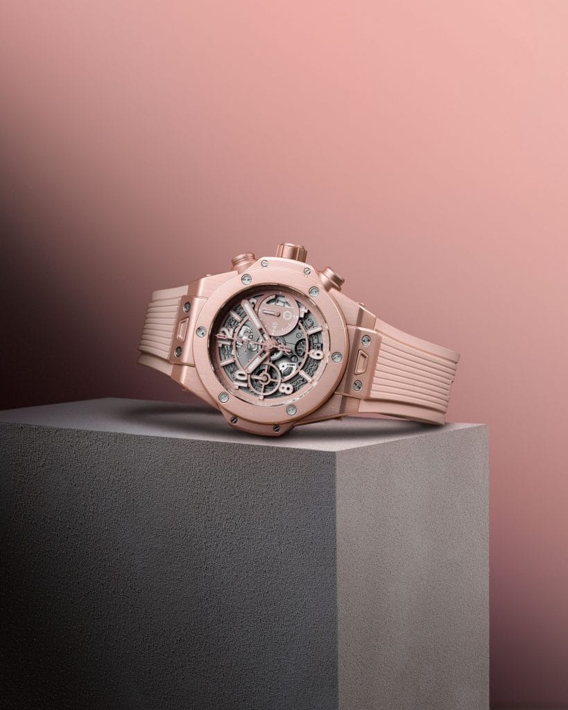 Son boîtier de 42mm donne le ton : un matériau moderne et léger, unisexe et monochrome, en aluminium anodisé et satiné, teinté dans la masse en rose millénial. Cette prouesse technique a été rendue possible grâce aux recherches des ingénieurs Hublot. L’obtention de cette couleur très spécifique est obtenue par anodisation, un procédé qui permet de protéger et de décorer une pièce, et qui présente l’avantage de conférer à la boîte et à ses composants la teinte pastel souhaitée doublée d’une remarquable tenue aux rayes et aux impacts. Ses proportions réduites la rendent accessible aux poignets. No gender! Le mouvement manufacture chronographe Unico, doté d’une réserve de marche de 72 heures, avec un mécanisme chronographe côté cadran et roue à colonne.