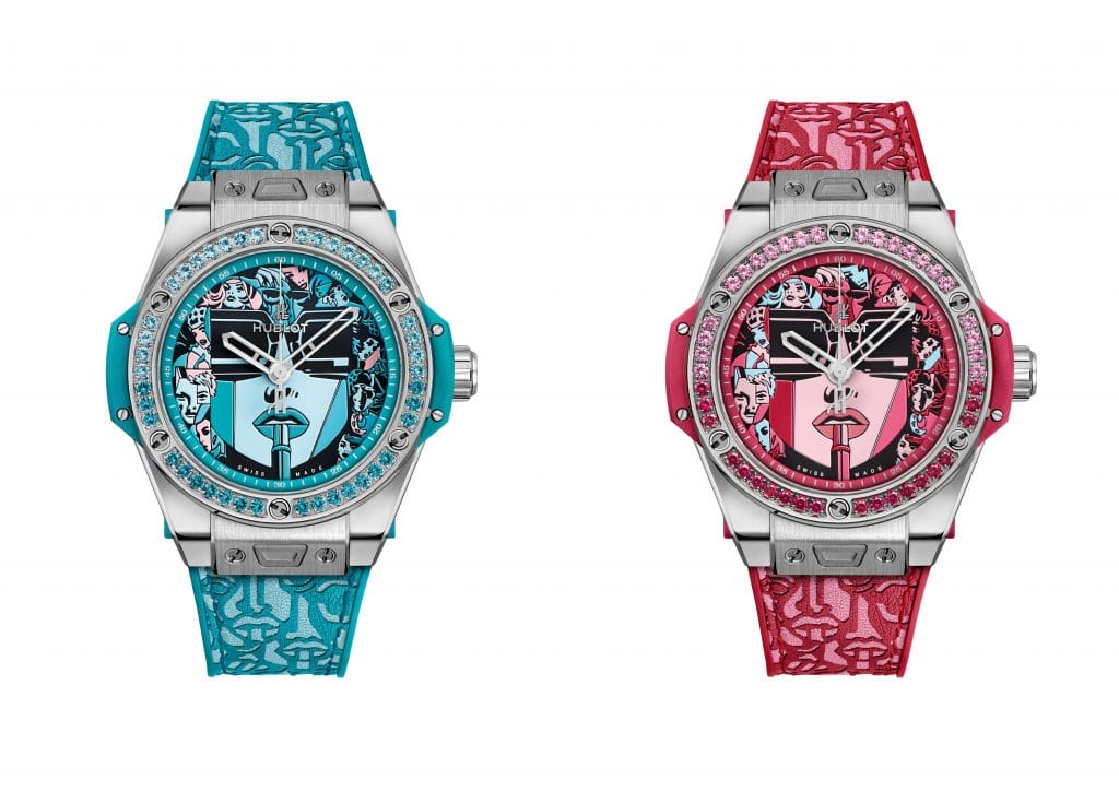 Le cadran raconte l’histoire de cette héroïne des temps modernes, Lipstick, œuvre iconique de l’artiste. Énigmatique, derrière ses lunettes noires, elle demeure souveraine face aux imprévus, affirme sa féminité, armée de son rouge à lèvres. Spinelles en camaïeu de rouge, topazes pour la déclinaison en turquoise, quarante-deux pierres fines ornent la lunette du nouveau boîtier de 39 mm, ajusté à ses poignets féminins. En une pression, le bracelet cuir fait place à la version alligator et caoutchouc, une touche de sophistication appropriée à l’instant. Déclinée en rouge et turquoise, la série spéciale se dote du système d’attache breveté « One click » et sera éditée en 50 exemplaires dans chacun des tons.