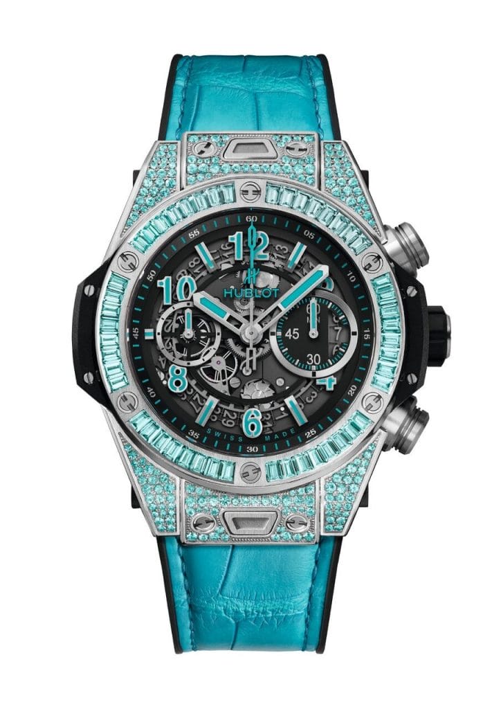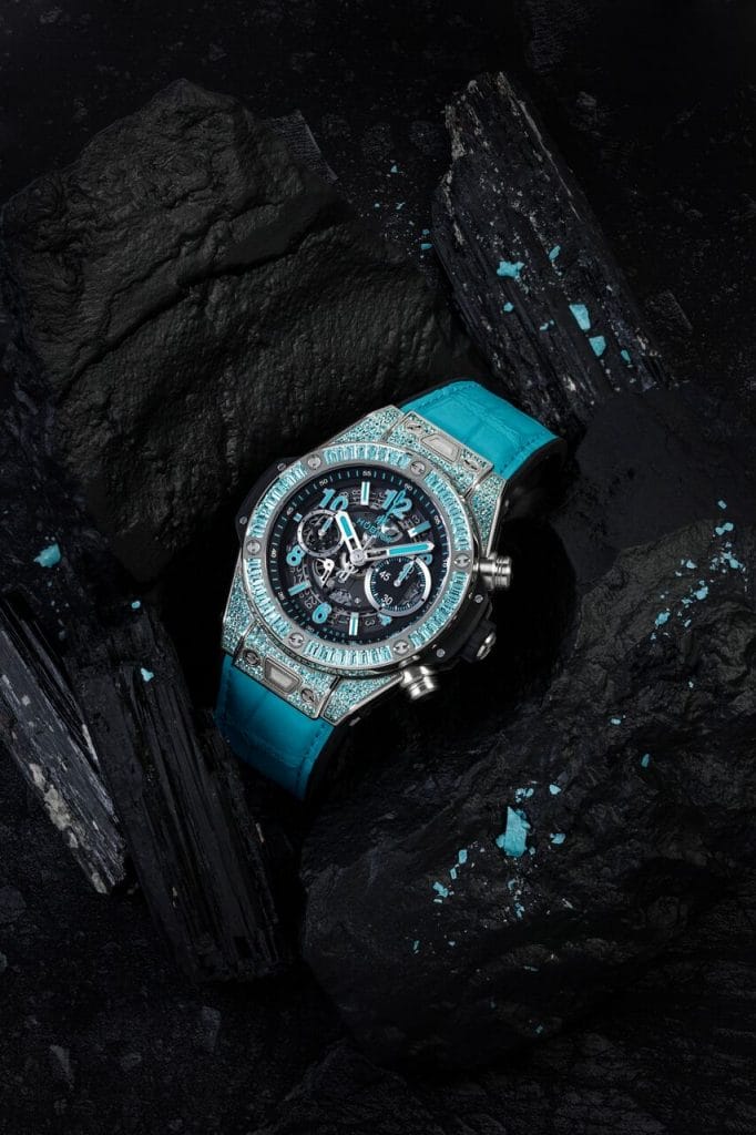 Pour la première fois, un horloger sertit sa montre de la brillance turquoise d’une cupro-elbaïte. Hublot électrise sa Big Bang des couleurs naturellement vibrantes et intenses de la Tourmaline Paraíba. Une pierre très rare dont on mesure toute l’exclusivité lorsqu’on sait qu’il y a en moyenne un Tourmaline Paraíba minée pour 10’000 diamants.