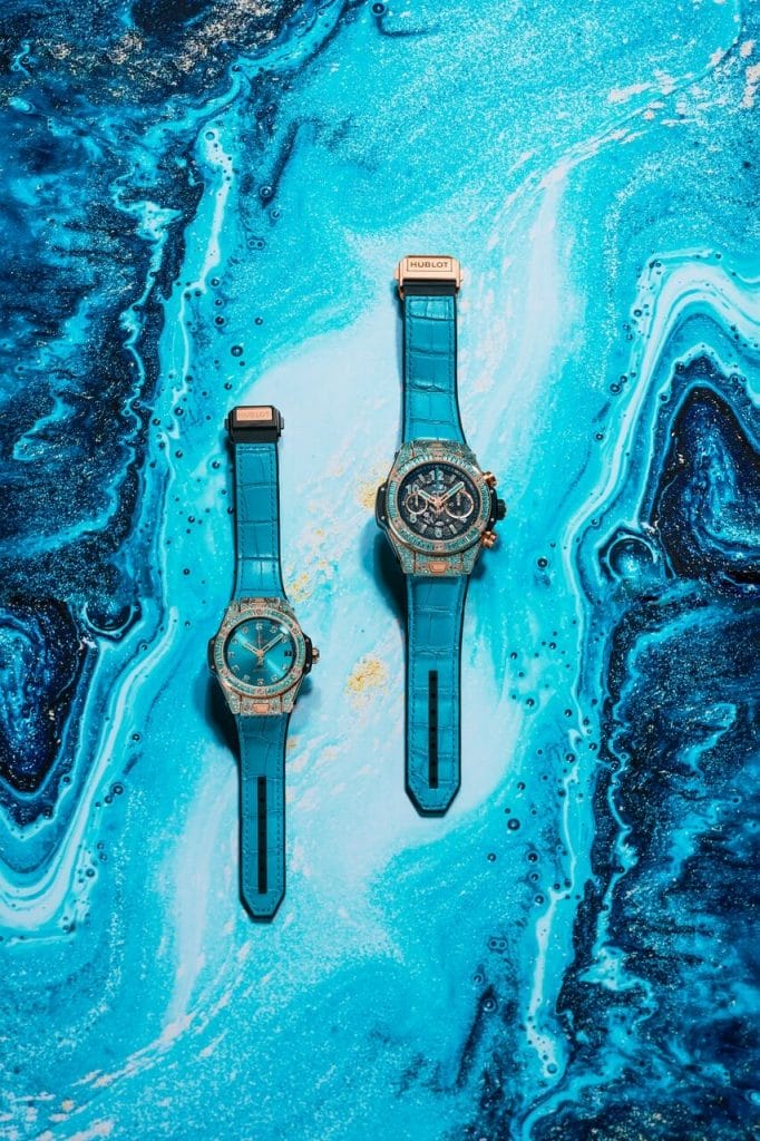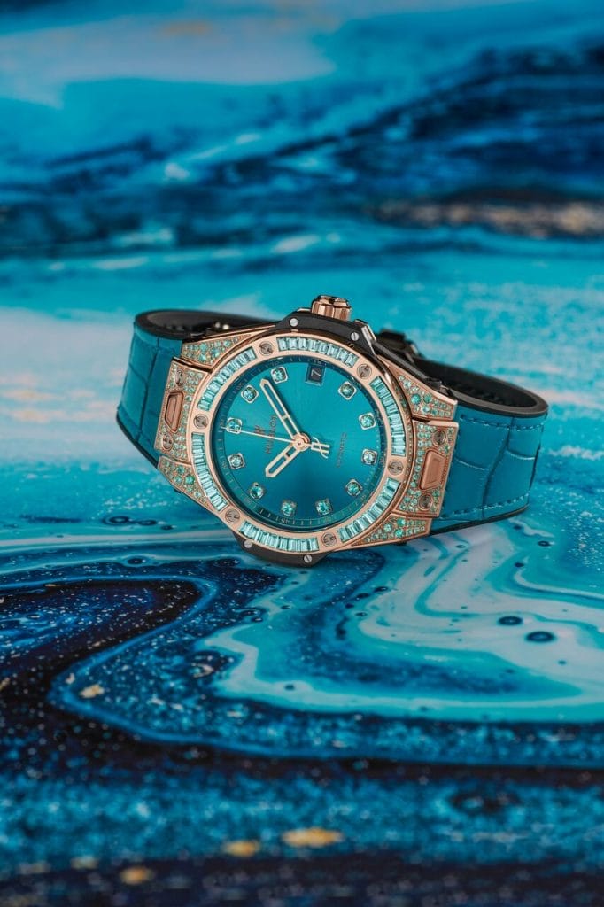 « La Big Bang Paraíba incarne la fusion de ce que la Nature a de plus beau à offrir. Une pierre née dans les sols riches du Brésil, un alliage naturel d’or, de cuivre et de manganèse, une couleur magnétique bleu lagon dont on ne peut détacher le regard». Ricardo Guadalupe, CEO Hublot