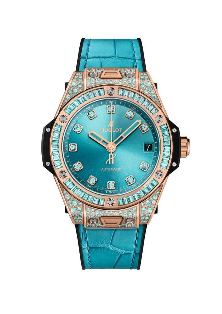 De sa lunette sertie de 48 Tourmaline Paraíba de taille baguette à son boîtier de 39mm habillé de 129 Tourmaline Paraíba de taille brillant, de son cadran soleillé ponctué de 11 Tourmalines Paraíba taille brillant au SuperLuminova de ses aiguilles jusqu’à son bracelet – interchangeable One Click breveté – en alligator cousu sur caoutchouc, la Big Bang Paraíba se nimbe des nuances turquoises de la plus rare des pierres. Editée en or blanc ou en King Gold (alliage Hublot d’or 18K avec cuivre et platine), elle vibre au rythme d’un mouvement mécanique à remontage automatique HUB1710 avec date à 3H et une réserve de marche de 50 heures. Geneva Days 2019