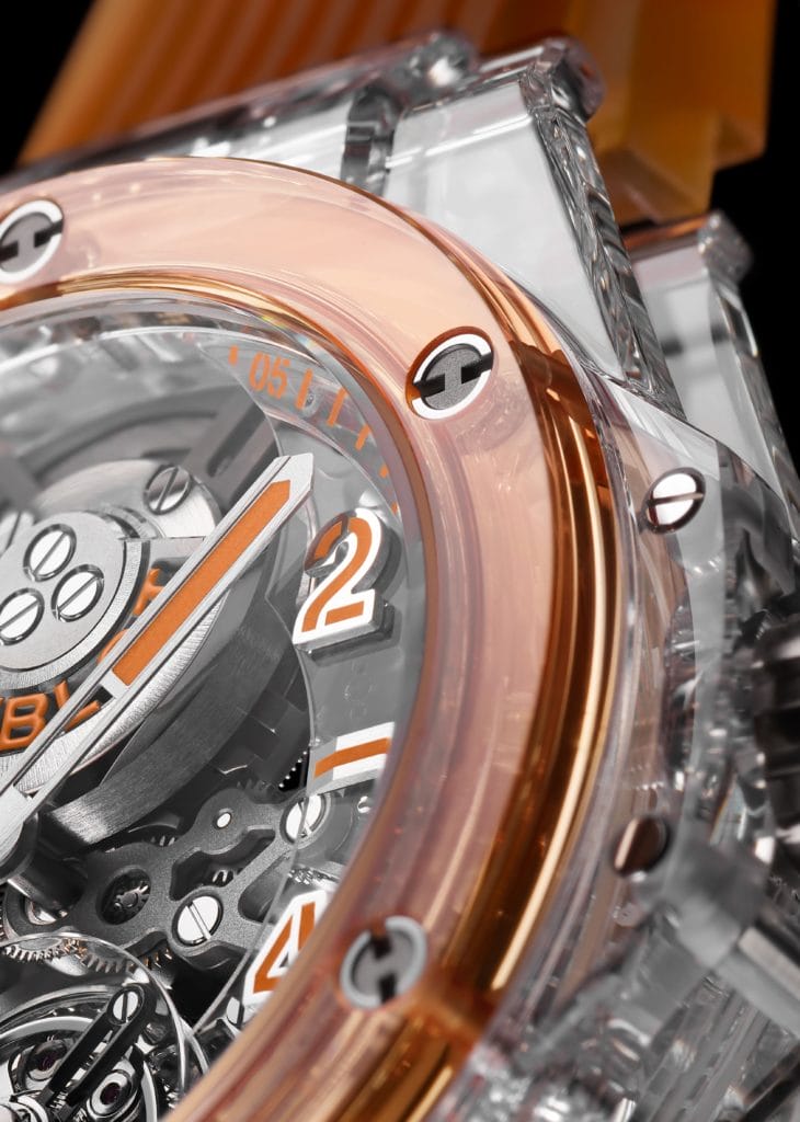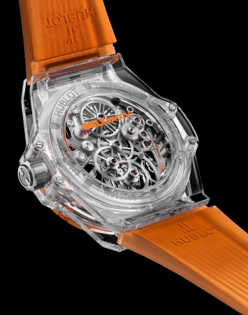 Une pièce unique taillée dans le saphir – transparent et orange –, au design iconique de la Big Bang et révélant la mécanique d’un mouvement manufacture tourbillon à remontage automatique avec ponts saphirs.