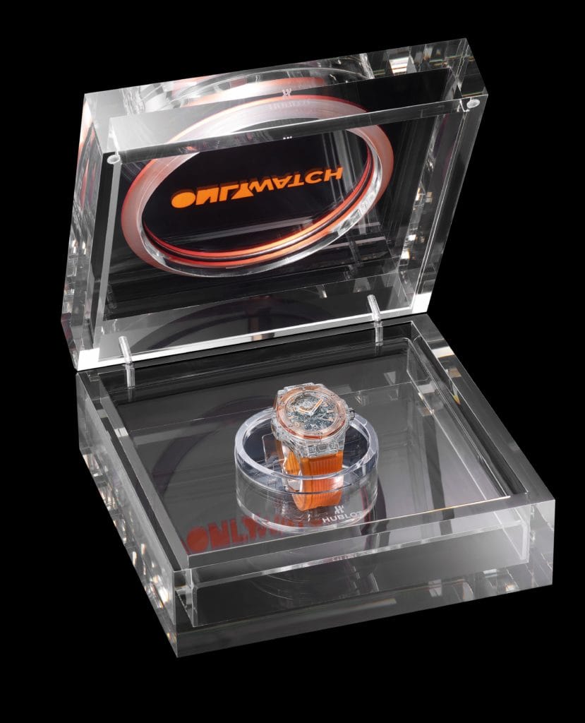 Sa transparence n’a rien à cacher, tout à dévoiler et l’horloger a les clés pour décliner ce matériel ultra-résistant et dur dans toutes les couleurs ou presque sans perdre sa clarté et sa pureté. Pour réaliser la lunette dans un saphir de couleur orange, Hublot, a une nouvelle fois inscrit une première mondiale à l’ordre de ses records. Un saphir teinté dans la masse, une couleur orange puissante, vibrante et positive née de la fusion du titane et du chrome et qui reprend les codes Only Watch. Afin de mettre en valeur cette pièce unique affichant une transparence totale, Hublot a décidé de tout montrer sans rien cacher jusqu’à l’écrin lui-même, entièrement taillé dans le saphir. De quoi admirer la Big Bang Tourbillon Only Watch comme une œuvre d’art, sous tous ses angles, de son poignet à son écrin.