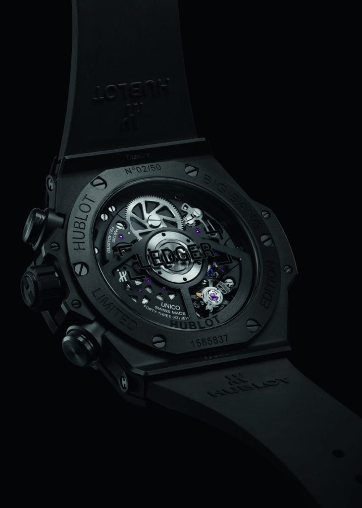 La notion d’ouverture est donc présente de façon homogène. Le fonctionnement du cadran à squelette de la Big Bang Unico Ledger est dévoilé, il expose l’élégant mécanisme de la montre, traditionnellement caché par un cadran. Quant à l’écrin, il nous fait plonger dans le monde des cryptomonnaies et de Ledger en particulier, société qui a bâti sa réputation en rendant public le fonctionnement de sa technologie.