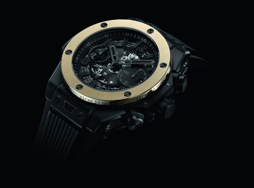 La montre s’inspire de la Big Bang Unico qui affiche un boîtier en céramique noir de 42 mm et un mouvement de chronographe automatique à squelette de la maison horlogère. L’aspect le plus frappant se retrouve dans la lunette dorée très contrastée de la montre, coulée dans de « l’Électrum » solide, un alliage naturel d’or et d’argent utilisé par les sociétés lydiennes aux alentours de -580 à -590, et destiné à frapper les premières pièces connues. La montre contient une version particulière de l’alliage, en acier inoxydable, développée par le département R&D de Hublot et qui contient un mélange où l’or et l’argent apparaissent à parts égales. Le leitmotiv latin des bitcoins, « Vires in Numeris », autrement dit la force dans les chiffres, est estampillé à six reprises sur le bord extérieur de la lunette. Ensemble, ces traits évoquent l’esprit des plus anciennes devises du monde et celui des plus récentes. Le fond de boîtier est gravé du logo Ledger et du numéro de l’édition limitée à 50 exemplaires.