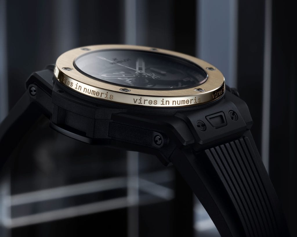 La montre s’inspire de la Big Bang Unico qui affiche un boîtier en céramique noir de 42 mm et un mouvement de chronographe automatique à squelette de la maison horlogère. L’aspect le plus frappant se retrouve dans la lunette dorée très contrastée de la montre, coulée dans de « l’Électrum » solide, un alliage naturel d’or et d’argent utilisé par les sociétés lydiennes aux alentours de -580 à -590, et destiné à frapper les premières pièces connues. La montre contient une version particulière de l’alliage, en acier inoxydable, développée par le département R&D de Hublot et qui contient un mélange où l’or et l’argent apparaissent à parts égales. Le leitmotiv latin des bitcoins, « Vires in Numeris », autrement dit la force dans les chiffres, est estampillé à six reprises sur le bord extérieur de la lunette. Ensemble, ces traits évoquent l’esprit des plus anciennes devises du monde et celui des plus récentes. Le fond de boîtier est gravé du logo Ledger et du numéro de l’édition limitée à 50 exemplaires.