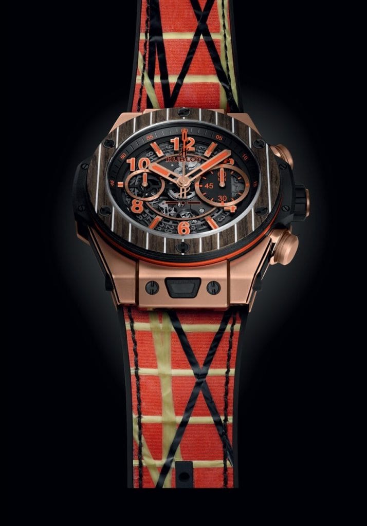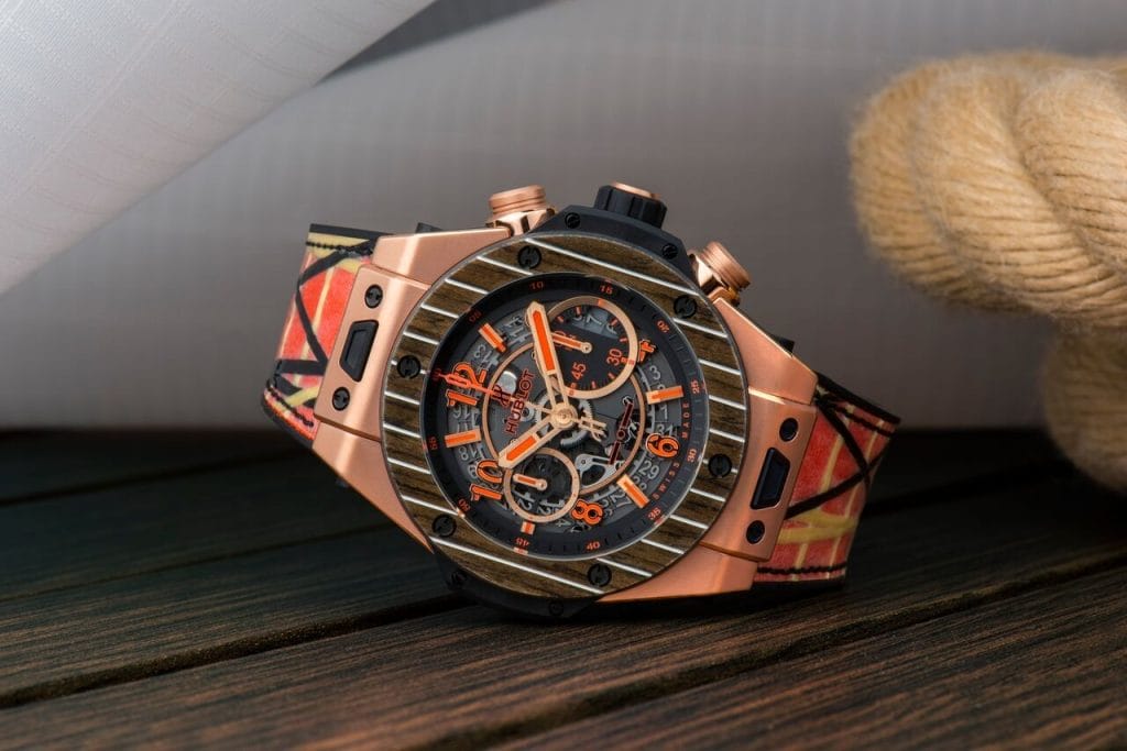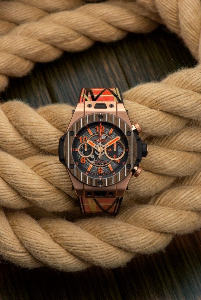 Basée sur le légendaire chronographe Big Bang Unico, cette montre reprend les codes stylistiques des voiliers de feu Gianni Agnelli, Azzurra, Agneta, Extra Beat, Stealth et plus particulièrement le Tiketitoo, dont la coque a été revêtue d’une douce couleur dorée. Le boîtier et les poussoirs sont usinés en King Gold, un alliage unique d’or et de platine développé par la manufacture Hublot. Sur le cadran, les indices sont de couleur orange, tandis que la lunette est découpée dans du teck, un bois précieux souvent présent sur le pont des bateaux les plus élégants. Avec 45 mm de diamètre et une étanchéité allant jusqu’à 100 mètres, la montre renferme le mouvement chronographe maison de calibre UNICO HUB1242, avec une réserve de marche de 72 heures. Ce chef-d’oeuvre de technologie et de compétences horlogères est visible à travers le verre saphir monté à l’arrière de la montre.