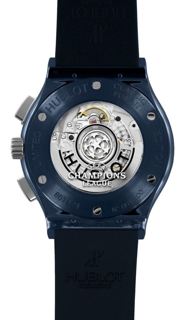 La montre est animée par le mouvement chronographe à remontage automatique HUB1155, qui dispose d’une réserve de marche de 42 heures. Le fond du boîtier en céramique bleue avec une glace saphir décorée du logo de l’UEFA Champions League confère la touche finale et donne à la montre son allure saisissante.