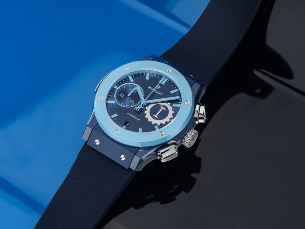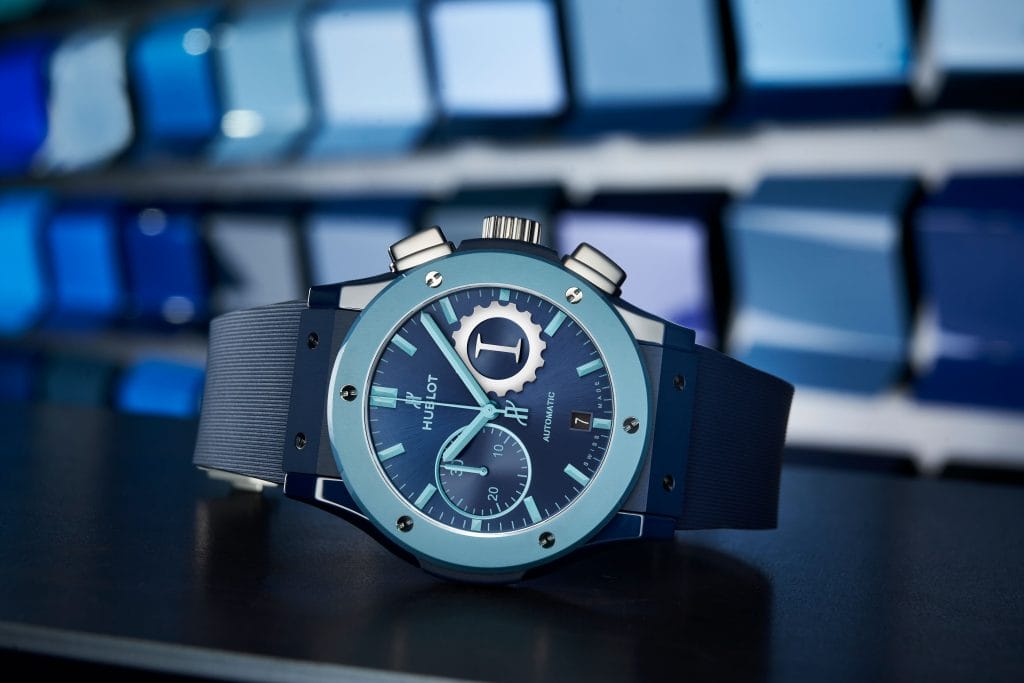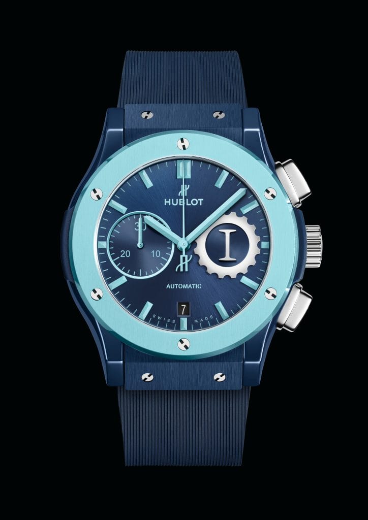 « La conquête des infinis Ciel, Terre, Mer, le rêve de tout aventurier concrétisé par l’atelier de Lapo Elkann. Interpréter à la perfection les codes de Garage Italia pour les faire nôtres, est un principe dans tout développement et plus encore ici. La lunette en céramique bleu ciel, une exclusivité qui signe cette démarche. » Ricardo Guadalupe CEO HUBLOT