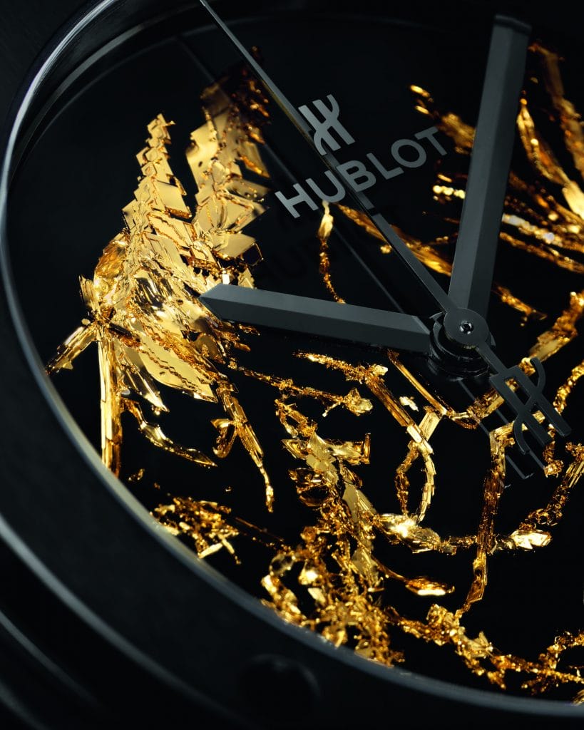 Le département Recherche & Développement de la manufacture Hublot chauffe l’or le plus pur possible – 24 carats – à son point de fusion, ce qui crée des émanations d’or que l’on pourrait assimiler à de la vapeur contenant des atomes d’or. Ces particules vont monter dans cette émanation, puis se figer sous forme cristalline dès lors qu’elles rencontrent une surface froide. Elles vont s’y agglomérer en cristaux en des formes complètement aléatoires, uniques et non reproductibles.