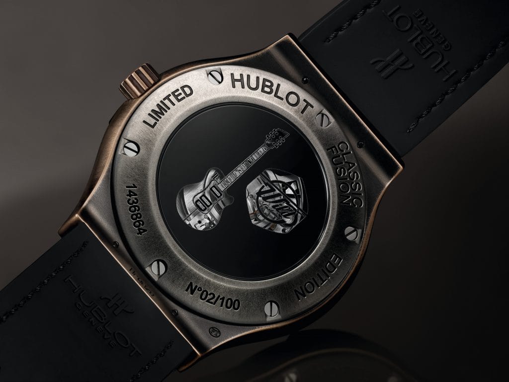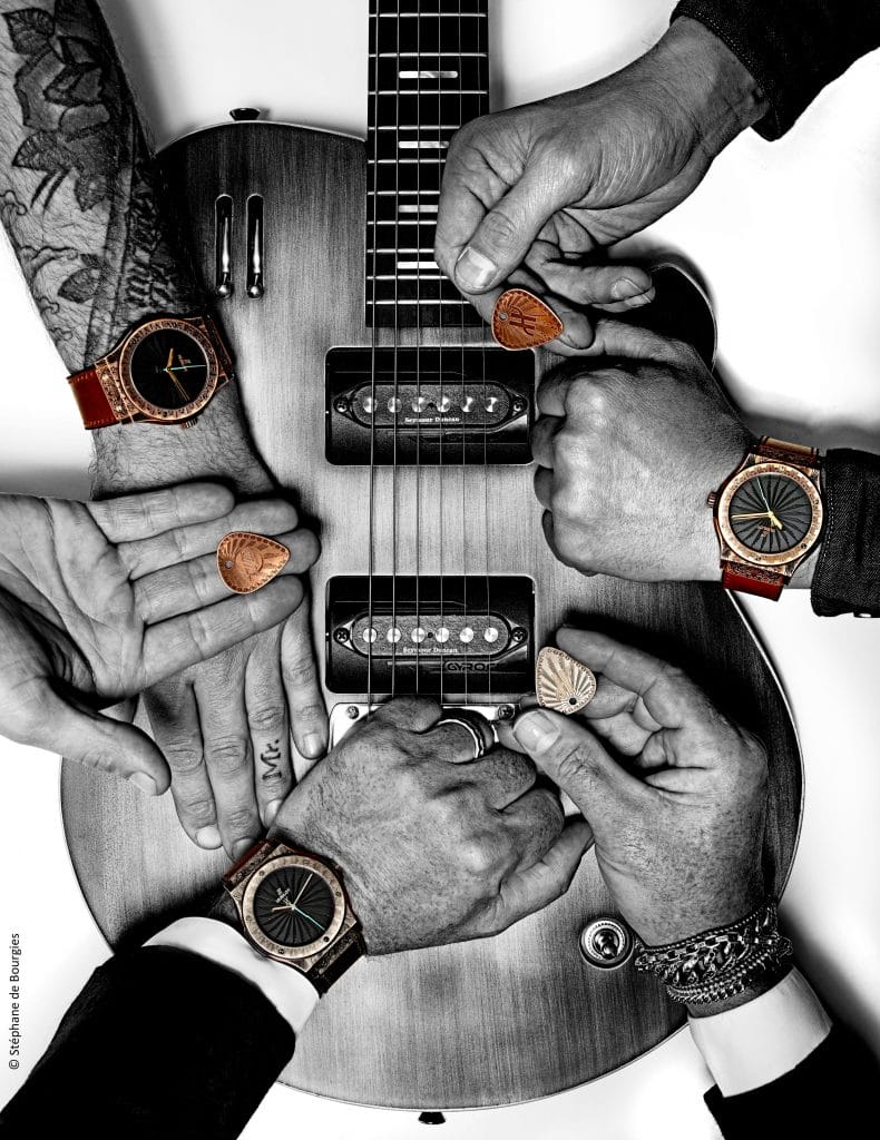 Wild Customs. Hublot. Le rock, les guitares et l’horlogerie. Leur point de fusion – Laurent Picciotto. Leur co-création – la Classic Fusion Wild Customs. Une montre qui raconte à travers ses iconographies l’histoire du rock’n’roll et symbolise la révolution que le fabricant de guitares indépendant va écrire dans l’univers de la musique avec Gyrock – un mécanisme innovant imaginé par Laurent Picciotto. En titane vieilli ou en bronze, la Classic Fusion Wild Customs incarne l’audace et l’innovation. Quand l’horlogerie et la musique se font plaisir !
