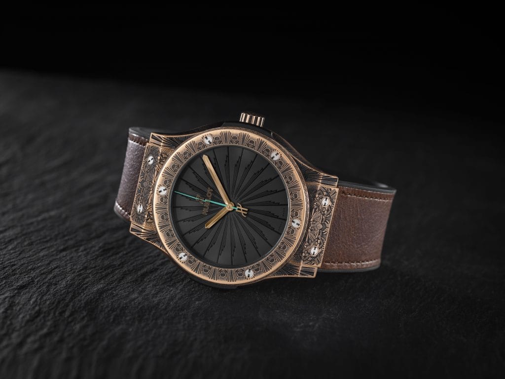 Le corps de son boîtier 45 mm est taillé dans le bronze noirci ou le titane vieilli, dans l’esprit de la technique « relic » des luthiers. Emblème de la musique rock, des têtes de mort stylisées gravent sa lunette en alternance avec un motif art déco qui habille la montre du boîtier au cadran. Un hommage à l’esprit d’avant-garde, à la conquête industrielle du début du 20ème siècle, inspiré par le célèbre Empire State Building et son hall majestueux. Aussi énergique que le rock, la trotteuse éclair en couleur surf green célèbre l’esprit pionnier des années 50 à 60, l’âge d’or de la guitare électrique, celui d’une créativité inégalée. Le tempo de la montre est rythmé par un mouvement mécanique à remontage automatique. Sanglée sur un cuir vintage marron ou noir cousu sur caoutchouc, la Classic Fusion Wild Customs est éditée à 2×100 exemplaires numérotés, accompagnés d’un plectre en bronze noirci et titane vieilli et d’un écrin exclusif, inspiré des deux maisons.