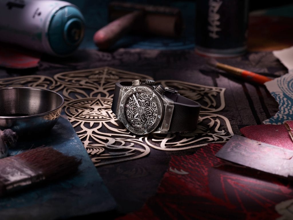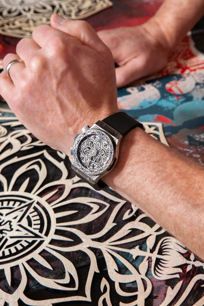 « L’impressionnante maestria des horlogers et ingénieurs d’Hublot dans leur domaine m’a permis d’aller plus loin dans l’expression de mon inspiration et de repousser les limites imposées par la technique et les matériaux. À vrai dire, le résultat final de cette seconde montre que je signe pour Hublot m’impressionne moi-même. J’ai souhaité y intégrer l’art du mandala qui suggère la connexion entre le moi intérieur et le monde extérieur, ce qui est un concept formidable à se rappeler lorsque l’on regarde sa montre en contemplant le temps. » Shepard Fairey Artiste
