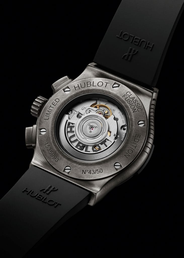 Hublot et Shepard Fairey ont choisi pour base de leur deuxième collaboration une montre issue de la collection Classic Fusion. Ici, l’artiste américain, très impliqué dans le projet, a choisi de donner vie à une œuvre symbolisant un mandala, un symbole ornemental qui puise simultanément ses origines dans plusieurs cultures à travers la planète. Il représente l’harmonie, le cycle de la vie et des éléments ainsi que la préciosité du temps dans l’esprit. Un motif ici gravé et brossé dans le titane, matériau dont sont composées la lunette et la boîte d’un diamètre de 45mm. Une œuvre qui se poursuit sur le cadran, lui aussi finement entaillé pour laisser entr’apercevoir le mouvement chronographe automatique, un calibre HUB1155 offrant une réserve de marche de 42 heures. Au centre des aiguilles s’affiche la signature de Fairey : le logo « Star Gear ». Montée sur un bracelet en caoutchouc noir ligné, la boucle déployante noire en acier inoxydable est également brossée.