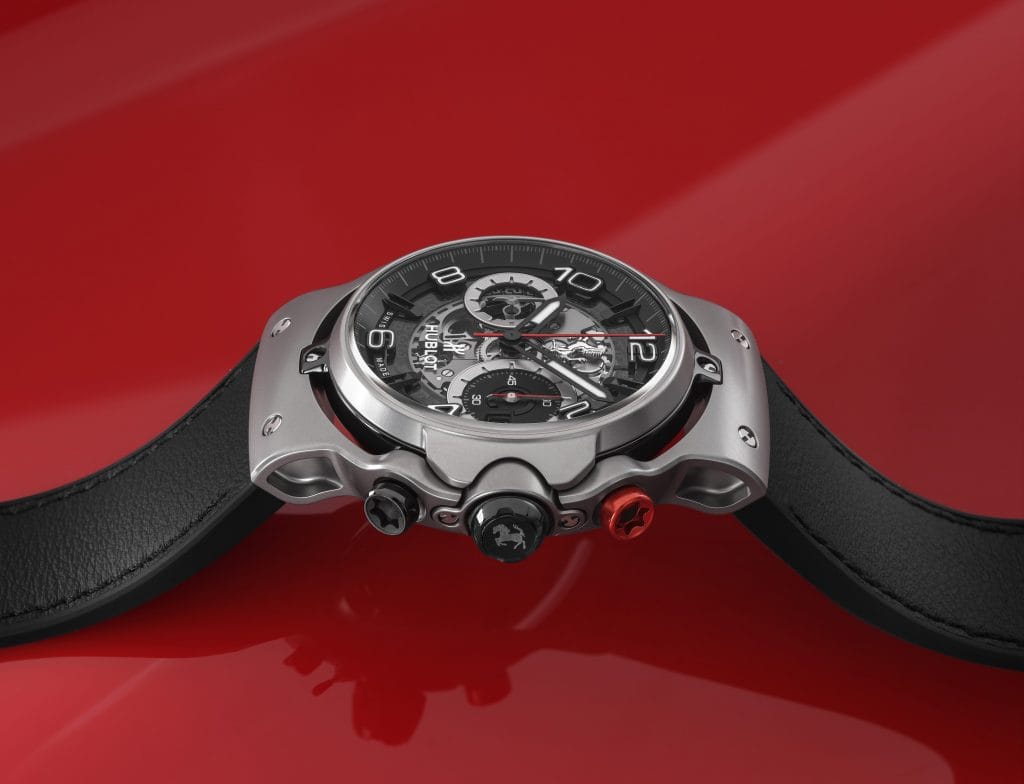 « Rouler pendant de longues distances à grande vitesse dans le confort et avec style. » Voilà comment résumer l’esprit « Gran Turismo » ; ce terme définissant également une catégorie d’autos luxueuses de petite production et à très hautes performances, en éditions limitées. Le monde de la GT est celui de l’innovation et du raffinement, de la passion pour la mécanique et le beau ; autant de valeurs communes à Ferrari et Hublot. Comme un hommage vibrant aux bolides de « Grand Tourisme », Hublot et Ferrari ont décidé cette année – et pour la première fois – d’unir leur sens de la créativité esthétique et de l’innovation mécanique dans une Classic Fusion, un châssis horloger à la fois classique et moderne, en phase avec les codes stylistiques de l’univers GT. Pour la première fois encore, le célèbre mouvement de manufacture Unico – d’une extrême finesse – a été intégré dans un boîtier de Classic Fusion de 45 mm de diamètre. Il s’agit du deuxième calibre chronographe maison dévoilé en 2018 (HUB1280). Protégé par quatre brevets, ce mouvement chronographe flyback à remontage automatique de 4 Hz (28’800 A/h) et roue à colonnes visible côté cadran, présente une fiche technique de champion avec notamment une épaisseur de seulement 6,75 mm et une réserve de marche de 3 jours très utile au quotidien. Totalement nouvelle, la Classic Fusion Ferrari GT se décline en trois versions de boîtier : Titane (édition limitée de 1000 pièces), King Gold (édition limitée de 500 pièces) et Carbone 3D (édition limitée de 500 pièces).