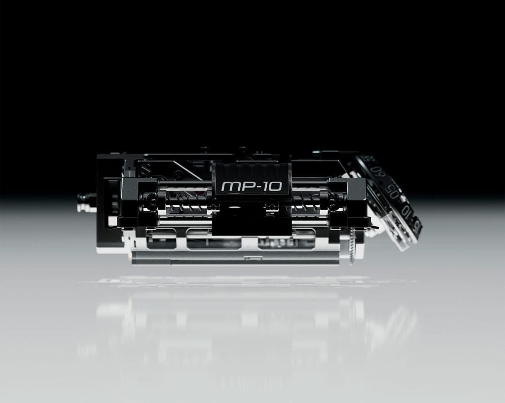 Son système de remontage suit la même logique. Un mouvement traditionnel se compose d’un cadran plat, doublé d’une masse oscillante côté fond. Mais une telle construction n’aurait eu aucun sens pour la MP-10 : la pièce n’a pas de cadran, pas d’aiguille, elle n’est pas plane, et se lit verticalement.