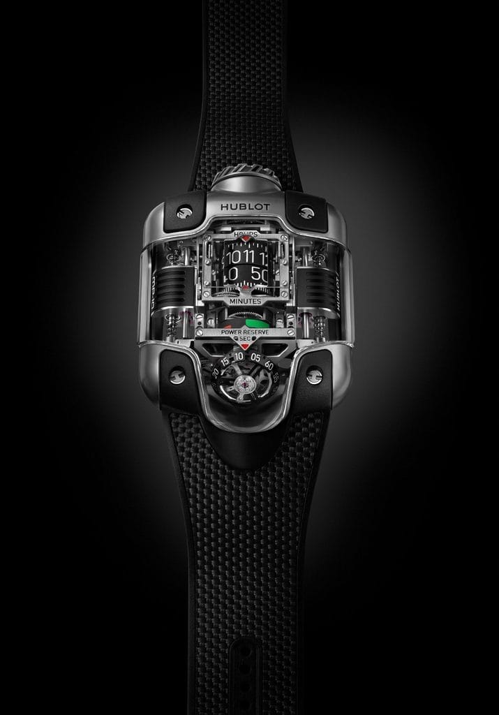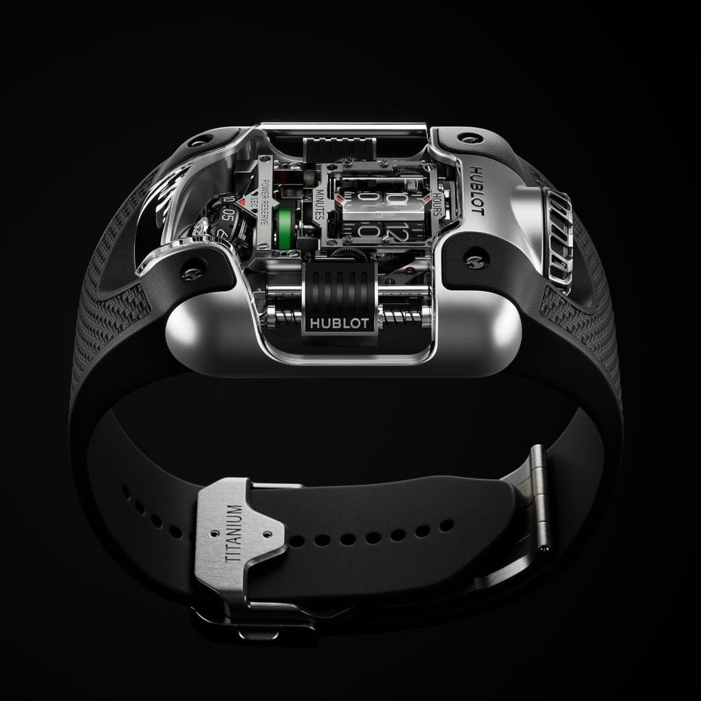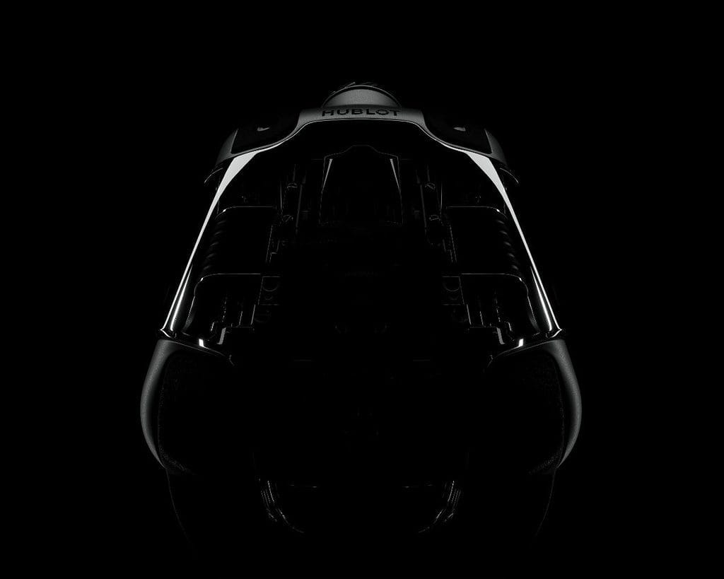 L’habillage, enfin, est au même niveau que le mouvement. Si la construction de la boîte est simple (deux pièces, carrure et fond en titane microbillé brillant), le verre saphir côté supérieur est le plus complexe jamais réalisé par Hublot, combinant des plans inclinés sur trois axes. Il en va de même pour le bracelet qui s’y intègre, en caoutchouc, également le plus perfectionné jamais dessiné par la Manufacture. Jusqu’à la future MP…