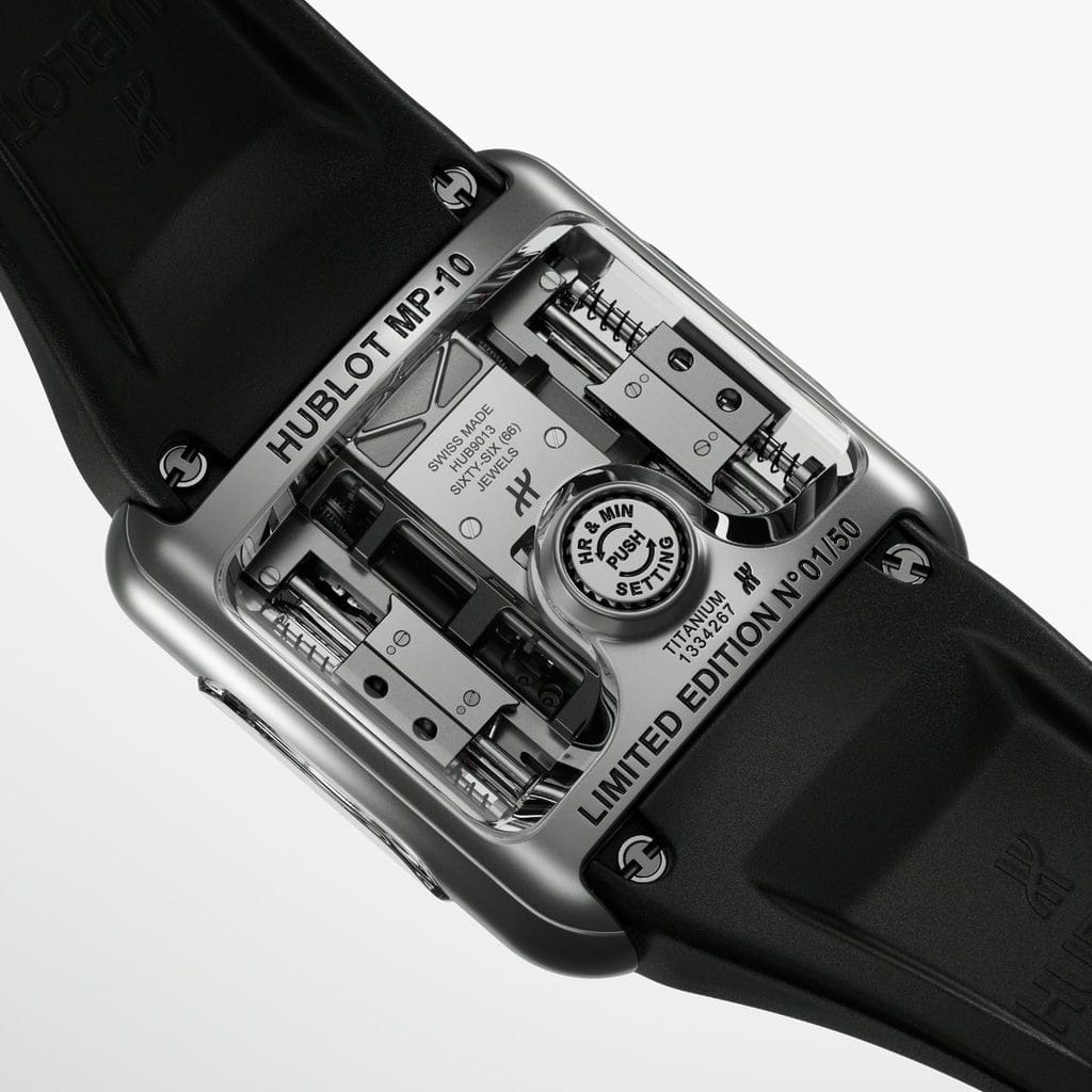 Pour que leur course ne vienne pas en heurter la butée, Hublot a développé un système d’amortissement des chocs. Ces deux masses verticales engrènent une crémaillère et sont capables de remonter le mouvement de manière bidirectionnelle – un développement 100% Hublot, égalementHUBLOT: www.hublot.com E-Mail: [email protected] & [email protected] Presselounge: presslounge.hublot.com/connection/ avec dépôt de brevet, et qui assure à la MP-10 une réserve de marche supérieure à 48 heures. Elle se remonte manuellement par la couronne à 12h, tandis que la mise à l’heure, pour ne pas entraver la fluidité du design, se fait par une seconde couronne nichée côté fond.
