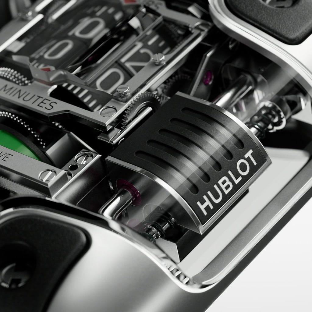 Les ingénieurs Hublot ont préservé le principe de masse, mais ils l’ont verticalisé, à l’image du mouvement, puis doublé. De part et d’autre de l’architecture centrale se trouvent deux blocs d’or gris, disposés sur un axe vertical le long duquel ils se déplacent librement.